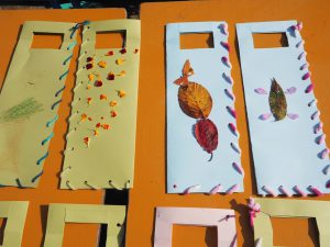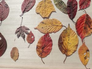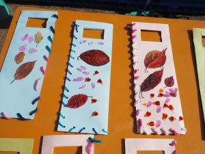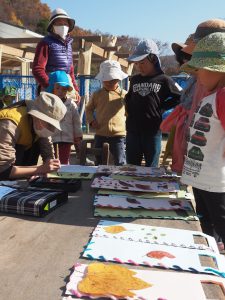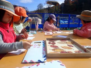 山道などで拾った葉っぱを押し葉にし、それを使って、思い思いのデザインを形にしていきました。