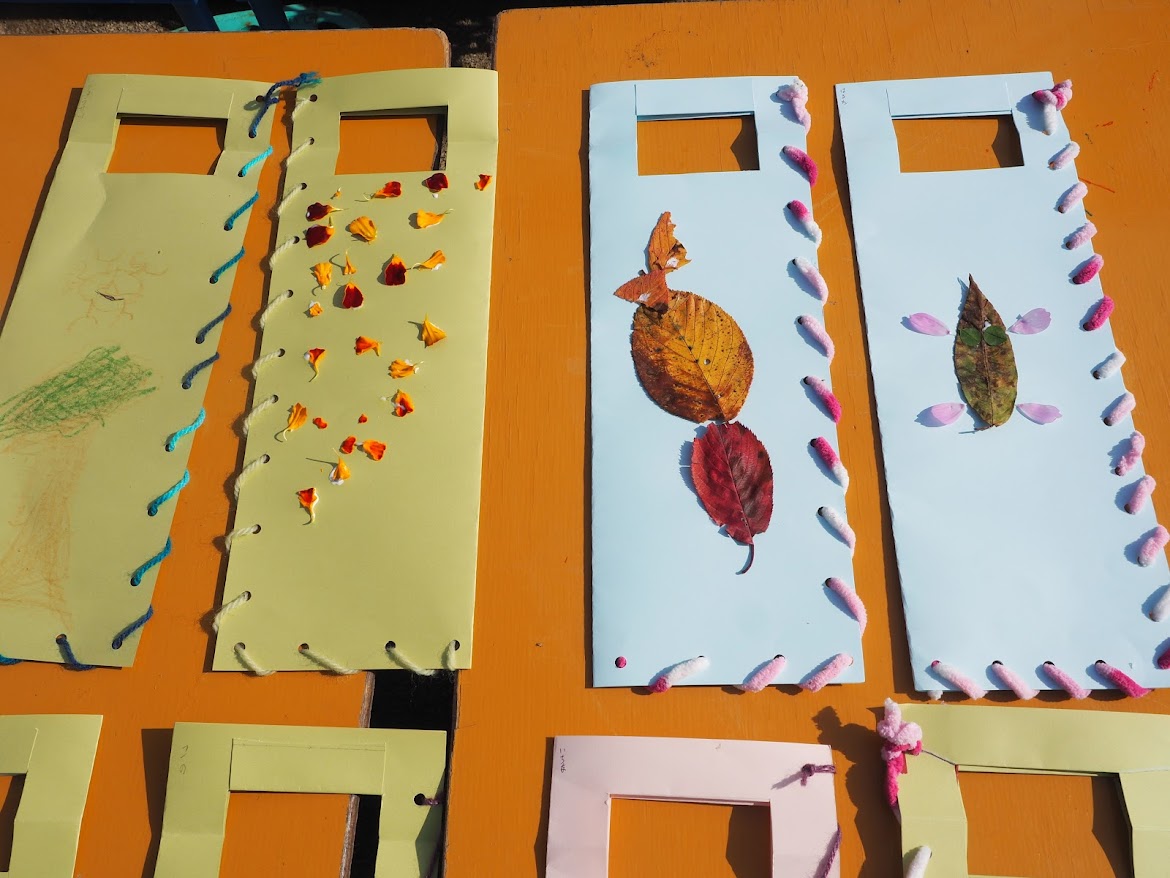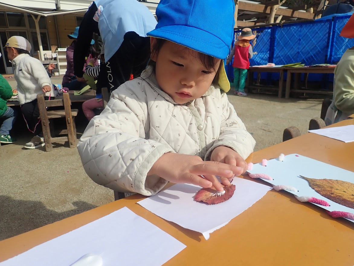 そんな様子から袋作りの表に「きれいなはっぱを1枚探して貼ろう」と保育士が課題を出すも、子どもたちは次々と様々な葉や花を見つけ自分のイメージ通りの【飴袋】を丁寧に仕上げました。