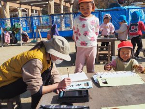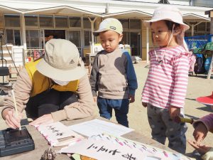 そして、書道部出身の保育者に墨と筆で名前を書いてもらいました。