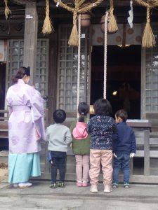 潮神明宮では、宮司さんや総代さんが待っていてくれました。神殿に通していただき、七五三の祝詞とこれからの健康を祈願してくださいました。宮司さんの真似をして、みんなで深々とお辞儀をしたり柏手をうったり、見様見真似ですが礼儀正しく(?)お参りしました。良い経験になりました。