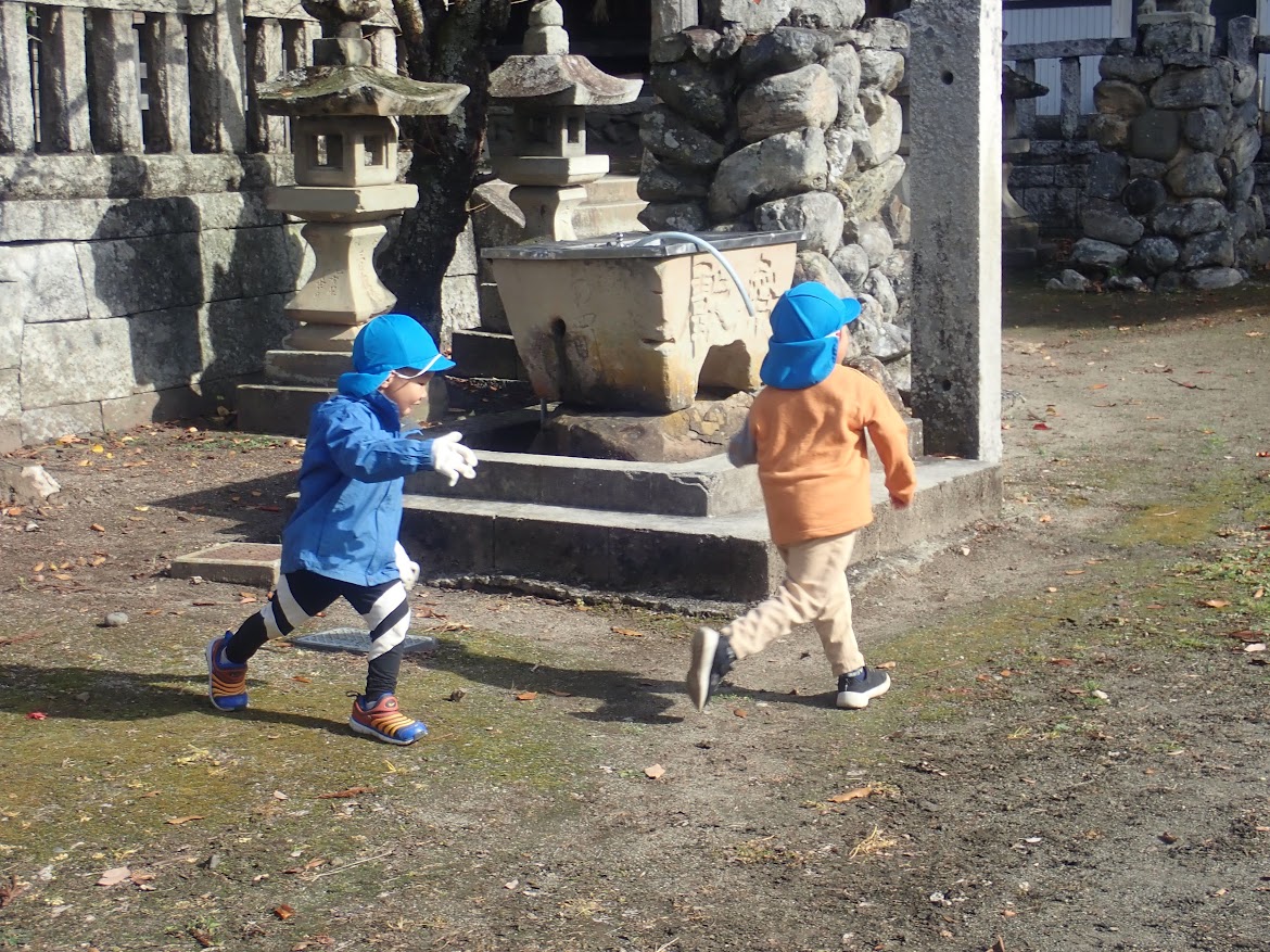 その後は、いつものように「とんびの羽、やろう」と鬼ごっこで境内を走り回りました。