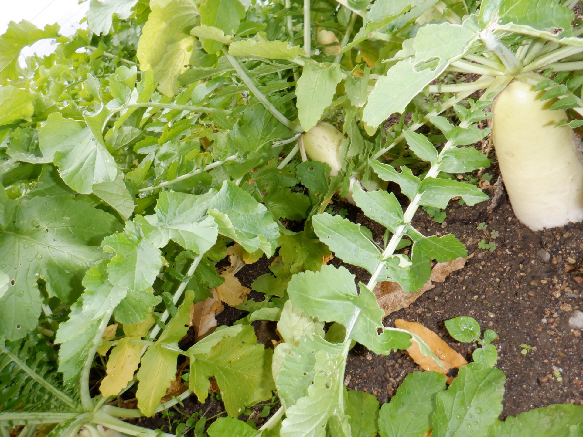 種の小ささを見て「大きくなるのかなあ・・・?」と不安になる子どもたちでしたが、すくすくと生長し驚くほど大きくなりました。途中、おろぬいた大根葉は味噌汁に入れてもらって味わいました。