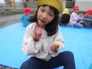 そして、掘ってから少し時間をおいた芋と、前日に掘った芋、どちらがおいしいか食べ比べもした年長さん。