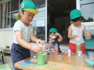 水遊びの延長で絵の具をだし、色水遊びをしました。初めは単色の色水のきれいさに喜んでいましたが、次第に色を混ぜ合わせ「きれー」「これ混ぜると何色になるかな」と子ども達で研究していました。