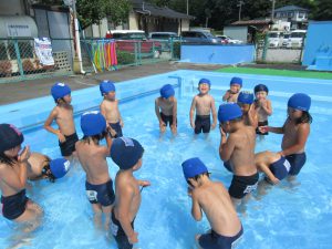 暑い日は熱中症アラートが発令され、晴れていても外に出られない日があり、「あつーい」「プール入りたーい」という声が自然と聞こえて来ました。プールに入ることを伝えると「やったー!!」と大喜びでプールに入る準備をしていました。プールに入ると「きもちー!」「たのしいー!」と水遊びを楽しむ中、「水があったかいよ」とプールの水が温水プールのようになっているのを感じていました。「出る時間だよ」と保育士が声かけをしても中々でてこようとしない子どもたちでした。