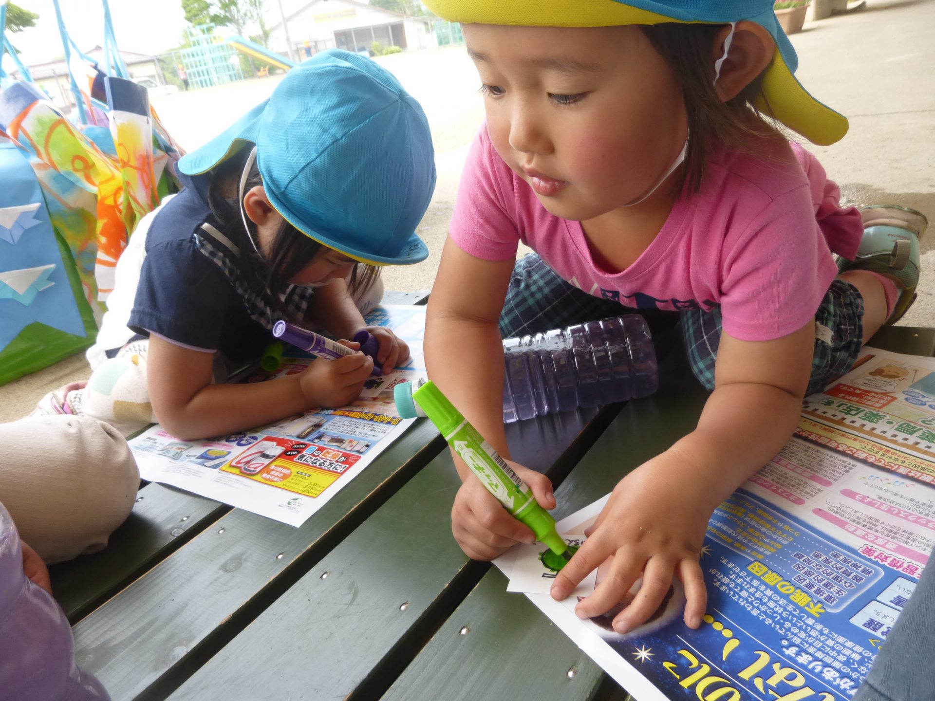 「ぶどうジュースは紫のお花を摘んでこよう。」と進んでぶどうジュースを作り、絵札の所に置いて楽しんでいます。
