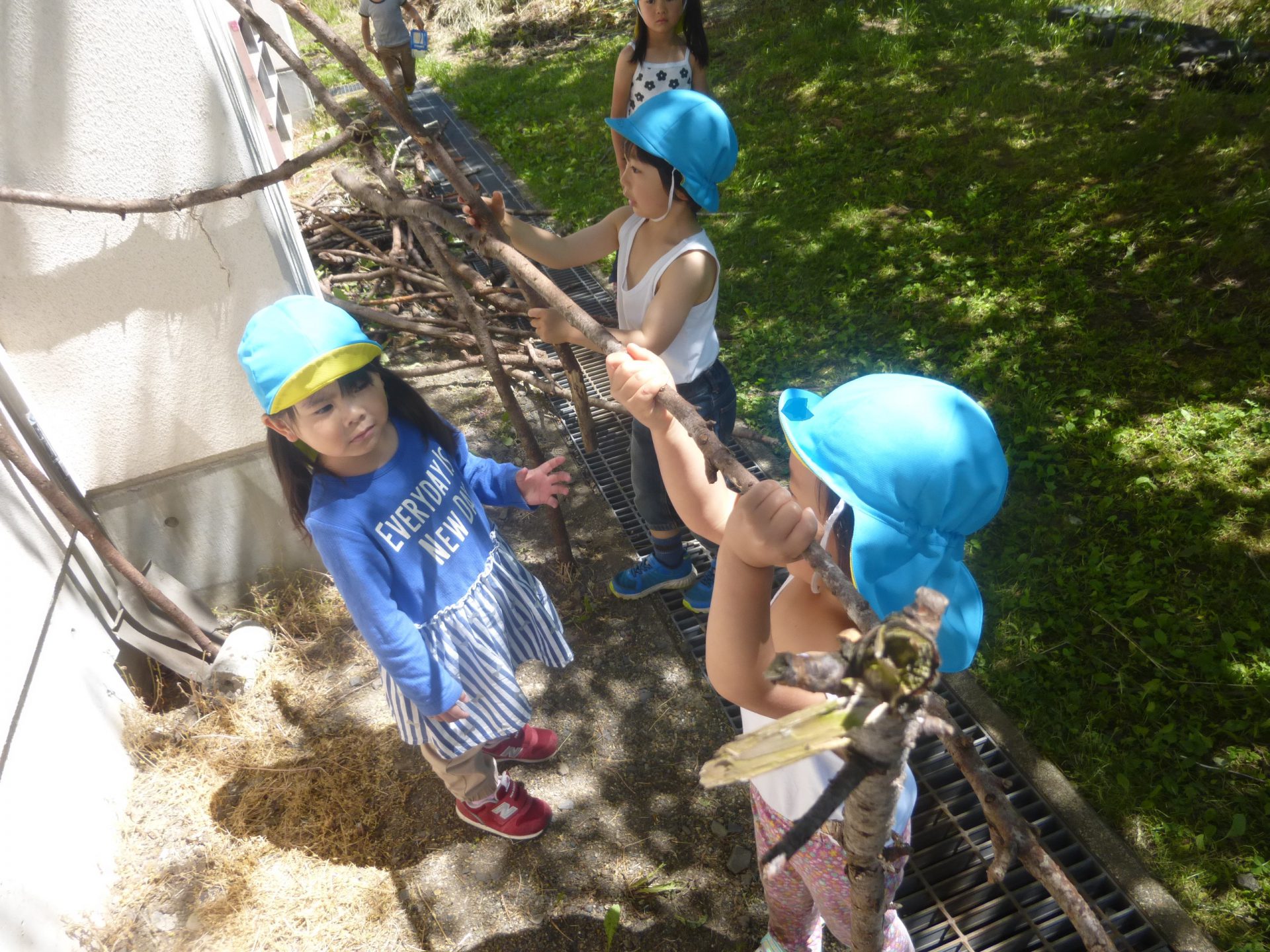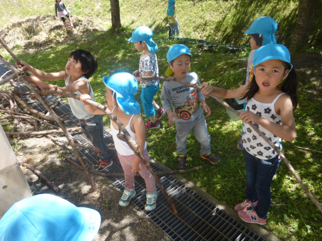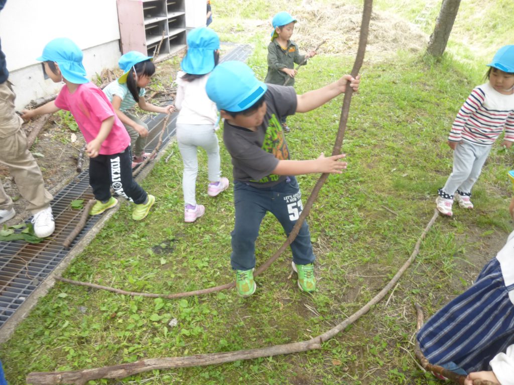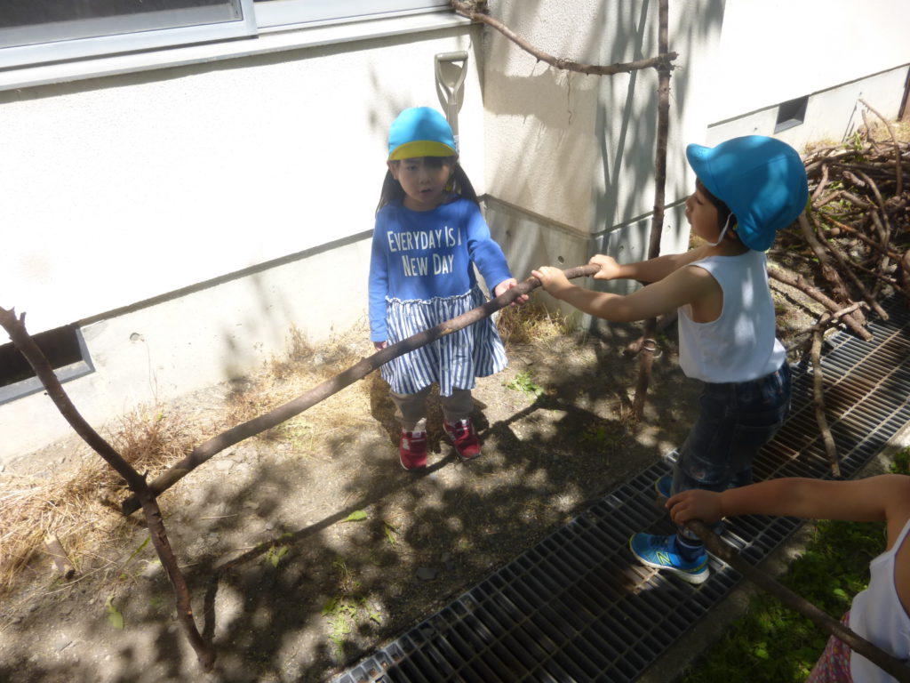 様々な木を持ってきては長さが合わないと返すのですが「折れば良いんだよ」と気がつき、一人で折れなければ友達と協力しながら長さを調節しています。何とか枠組みが完成しました。