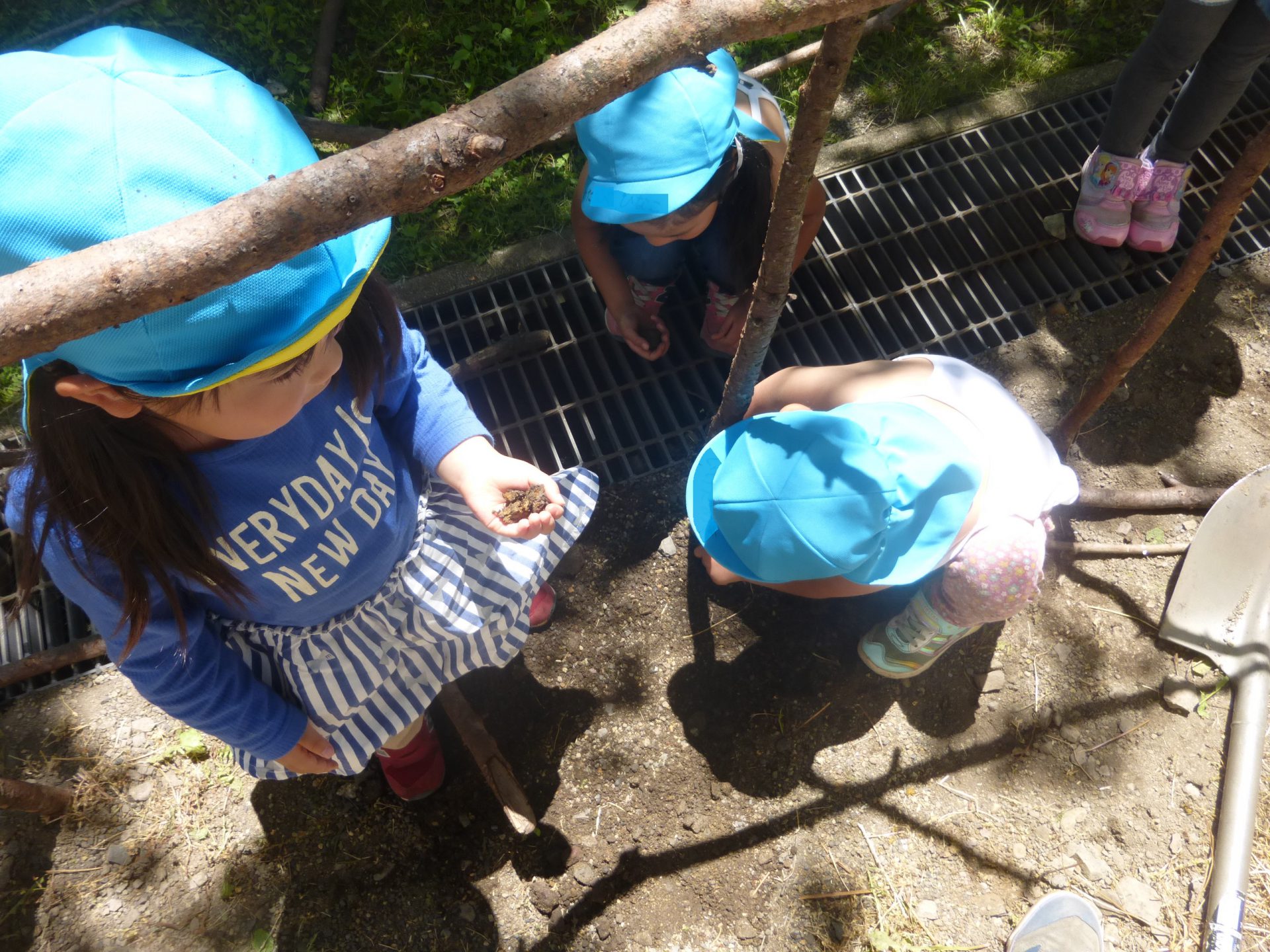 昨年の5才児が使った木の枝が沢山あるので大きい木を選び土台を作るのですが地面が固く、シャベルでもびくともしません。そこで子ども達と相談しながら一緒に進めていくことにしました。