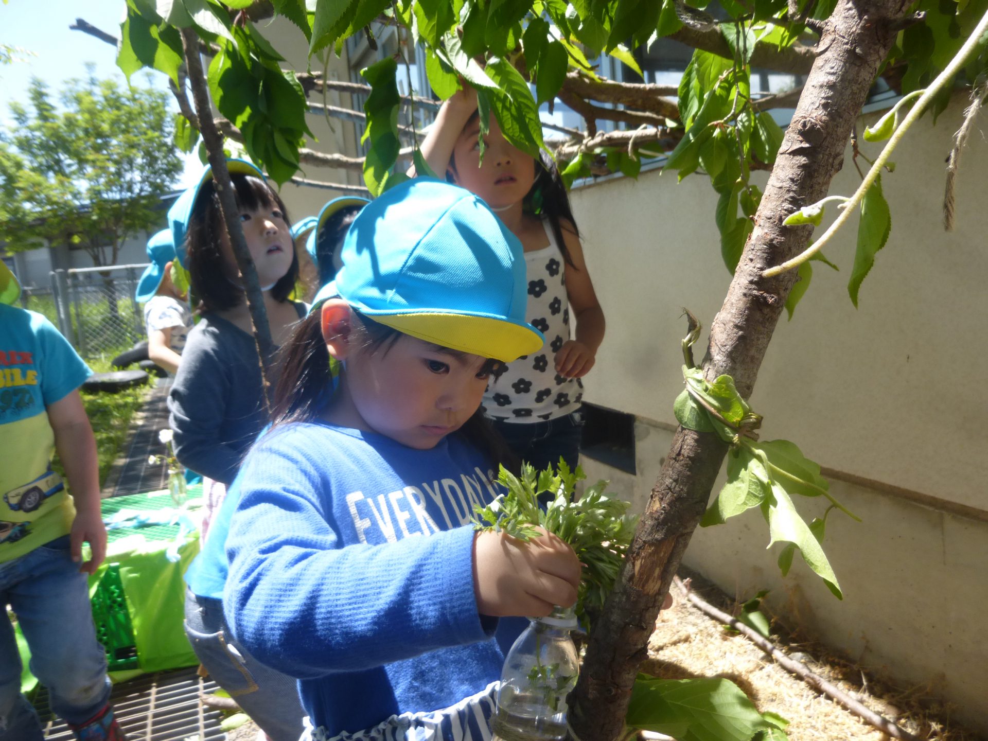 たくさんの虫が来てくれるようにお花やよもぎをかざっている子ども達です。