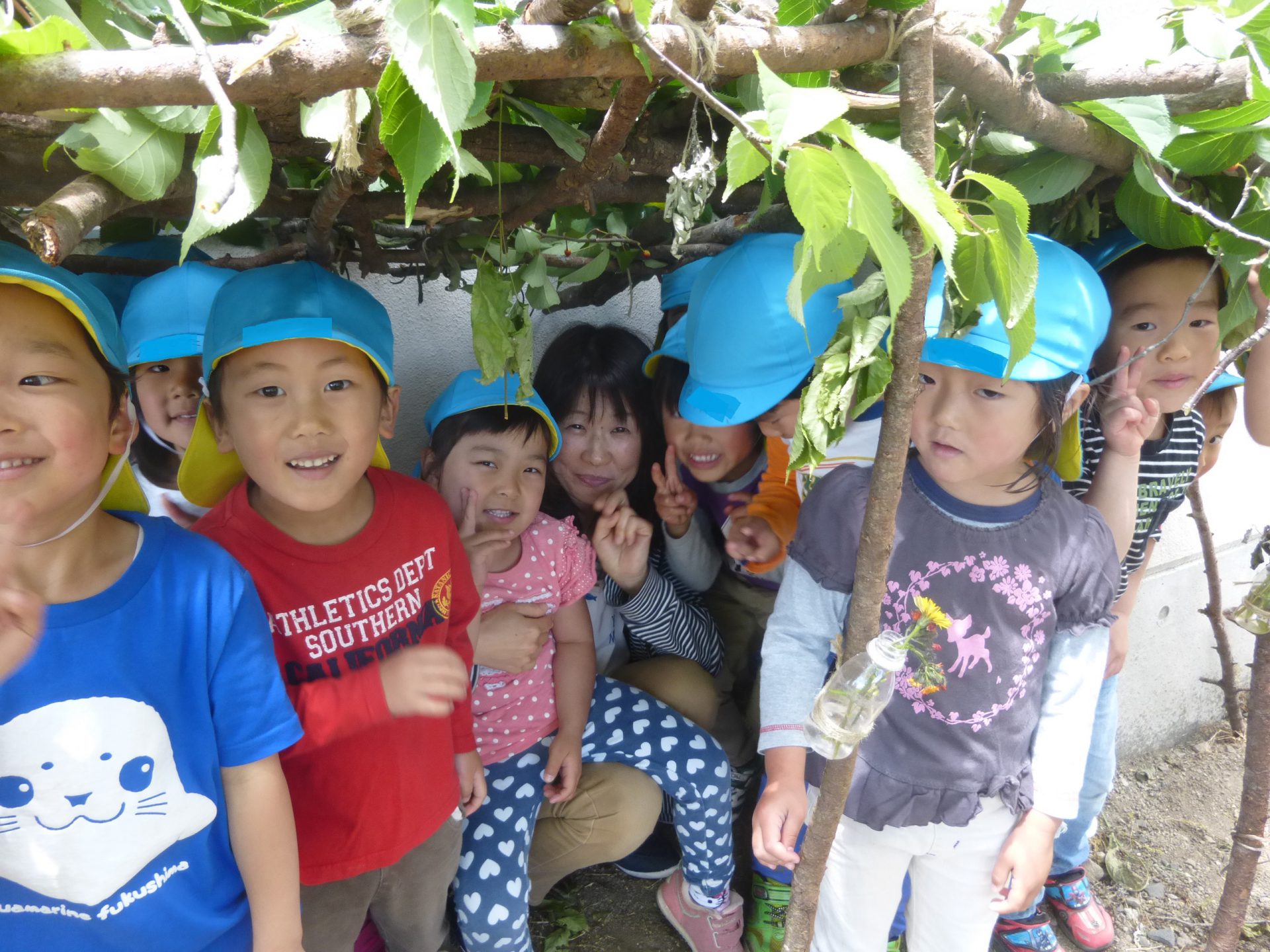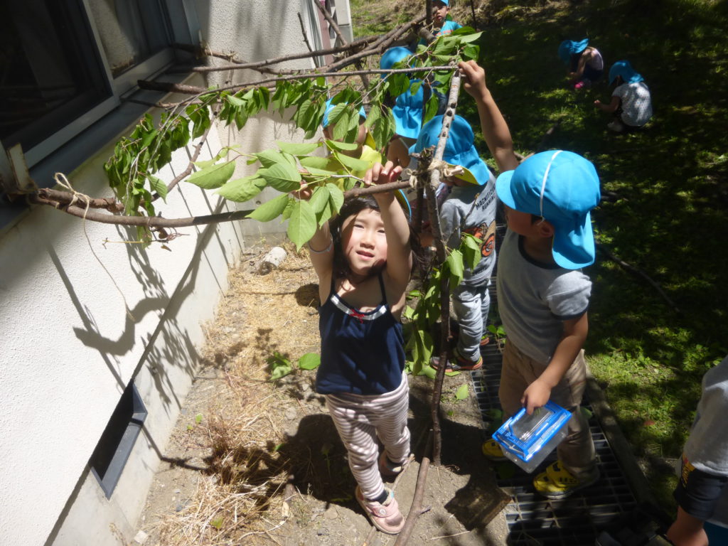 と言うことで園長先生に「はっぱのお家を作りたいから桜の木折ってもいいですか。」と相談に行きました。