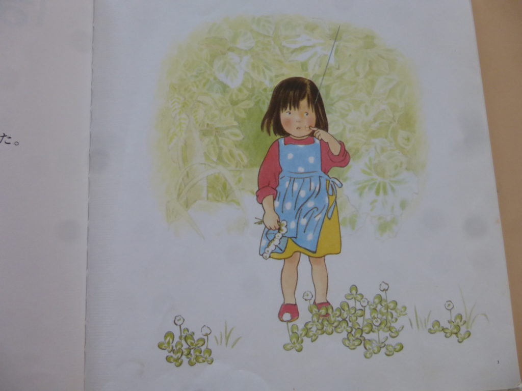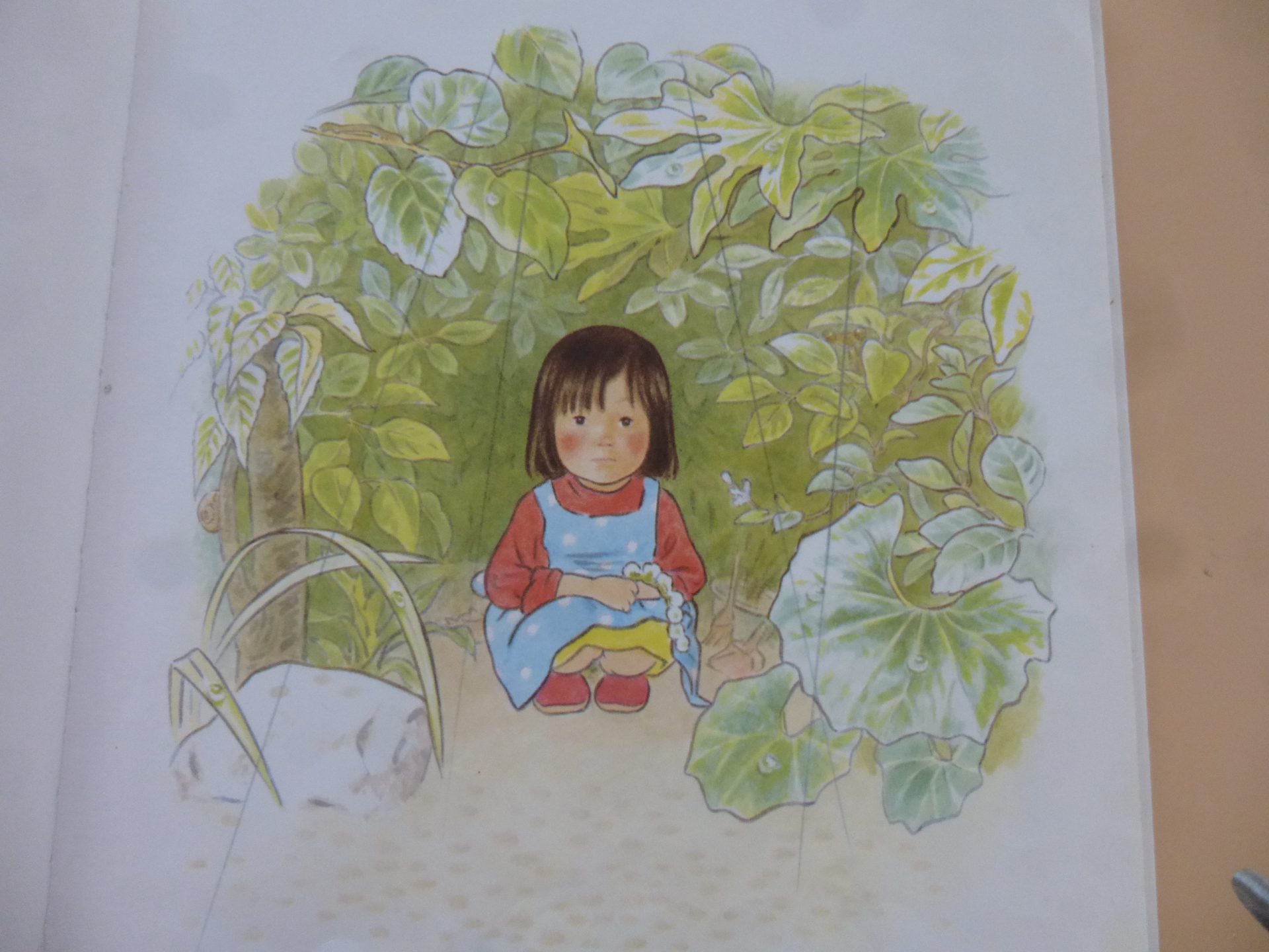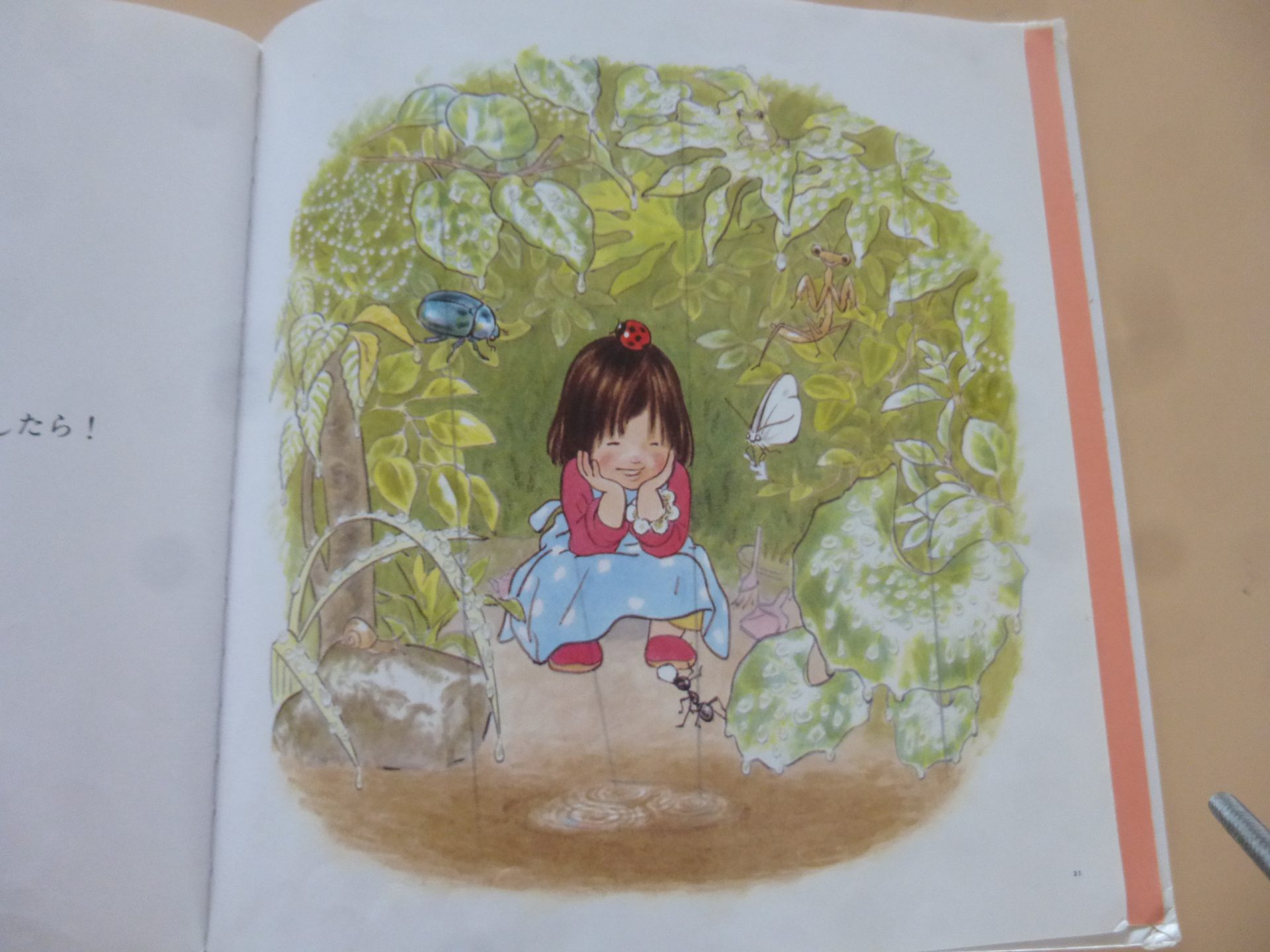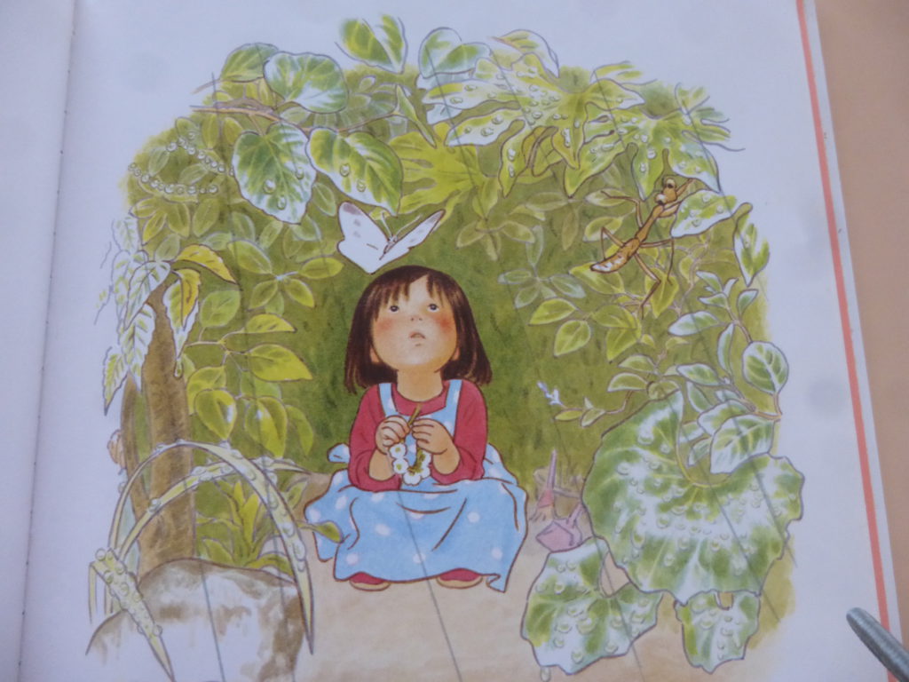 気付くと沢山の生き物が集まり、女の子も嬉しそう。この後雨がやみお母さんの待つ家へ帰るお話です。