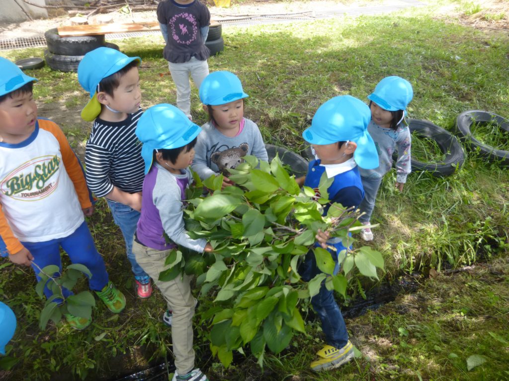 園長先生からは「お家を作るという目的があること」「色々な枝をむやみに採るのではなく、先生の話を聞いて約束を守って採ること」を約束して桜の木の枝を乗せてみました。
