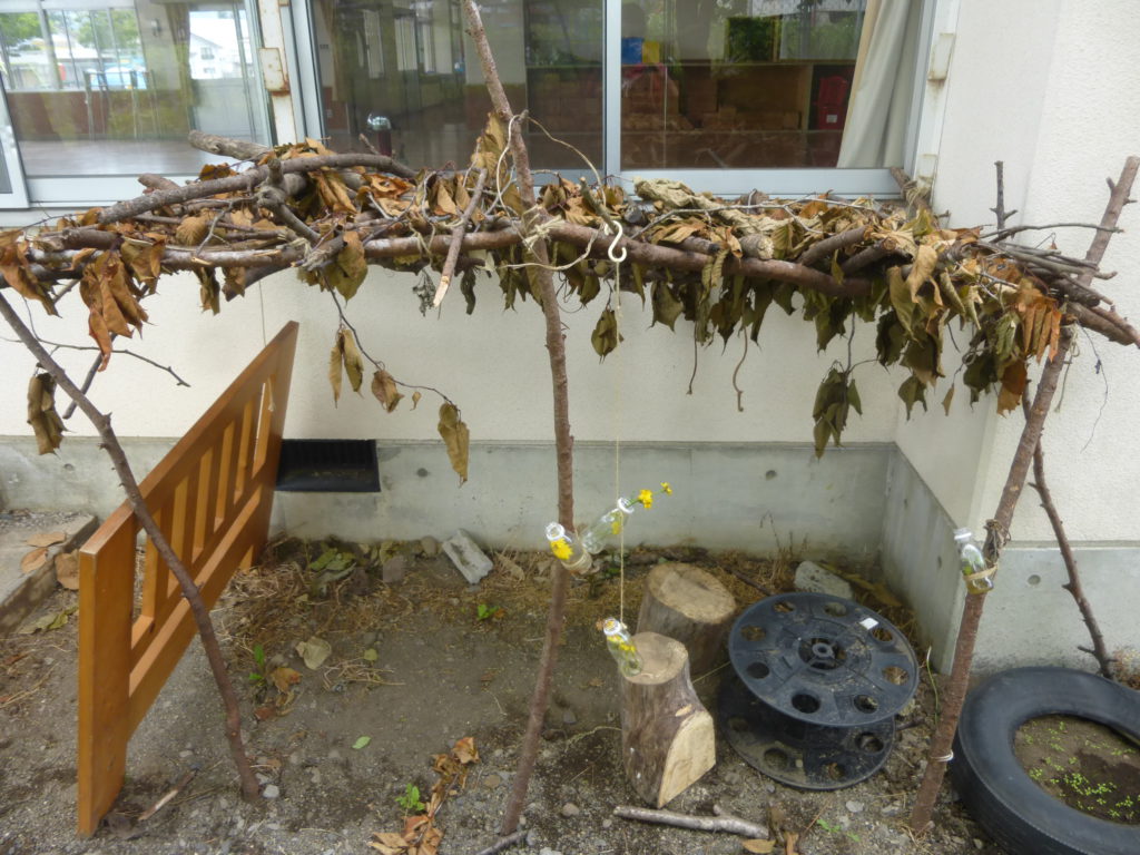 現在、こどもたちの作った「はっぱのおうち」はさくらんぼの枝がすっかり枯れてしまいました。