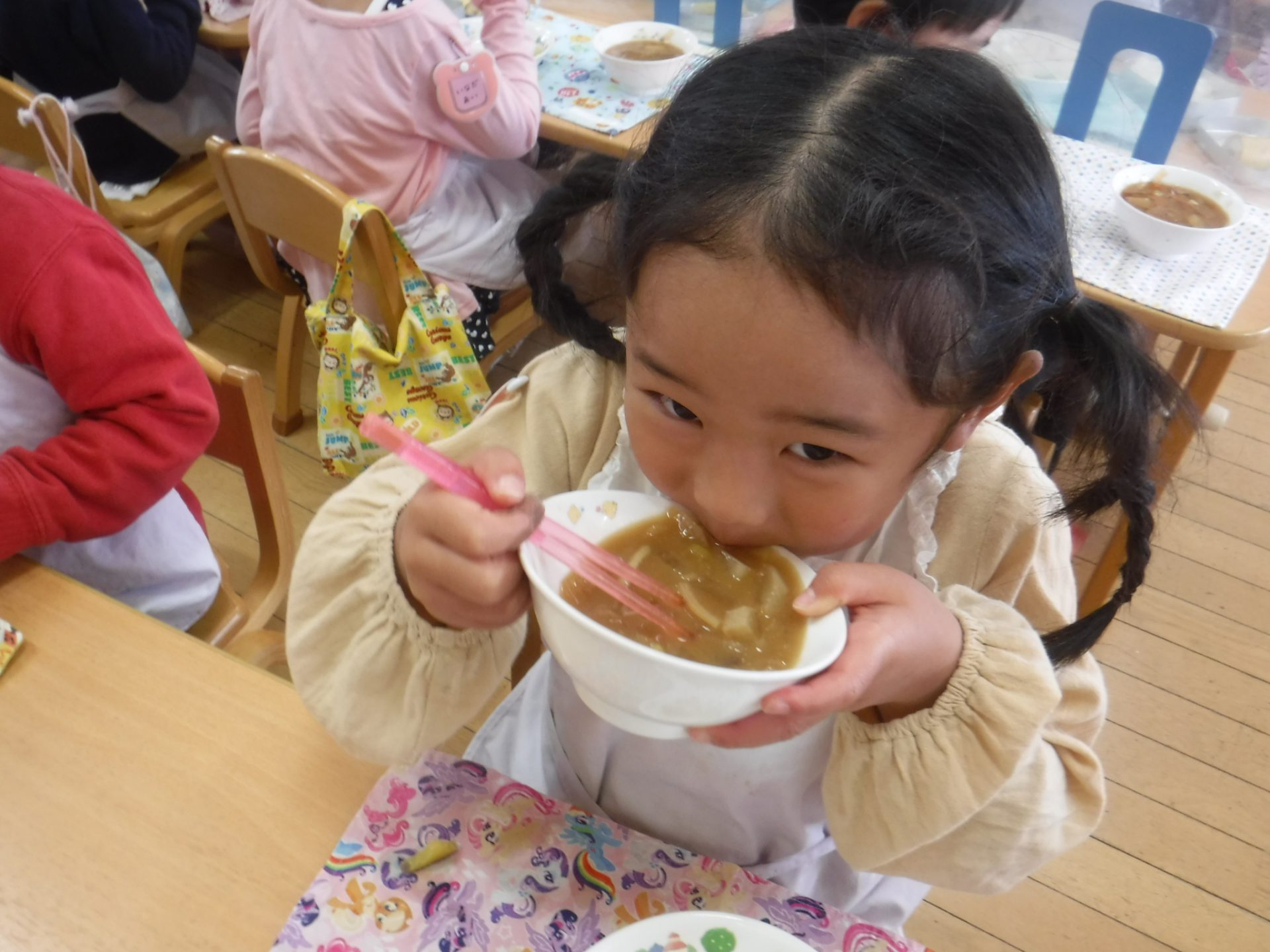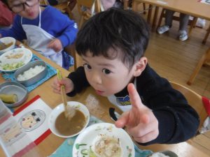 給食の時間になり、みんなで作った豚汁を食べてみました。