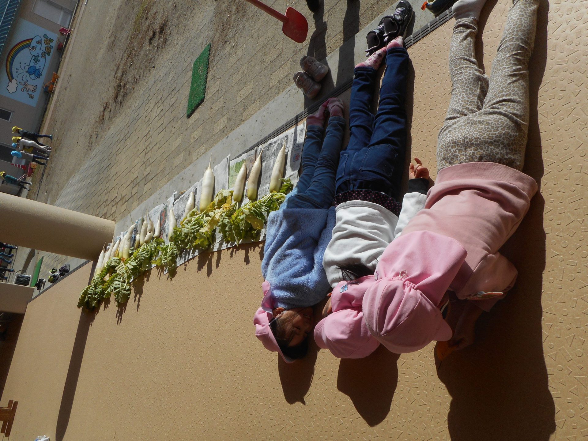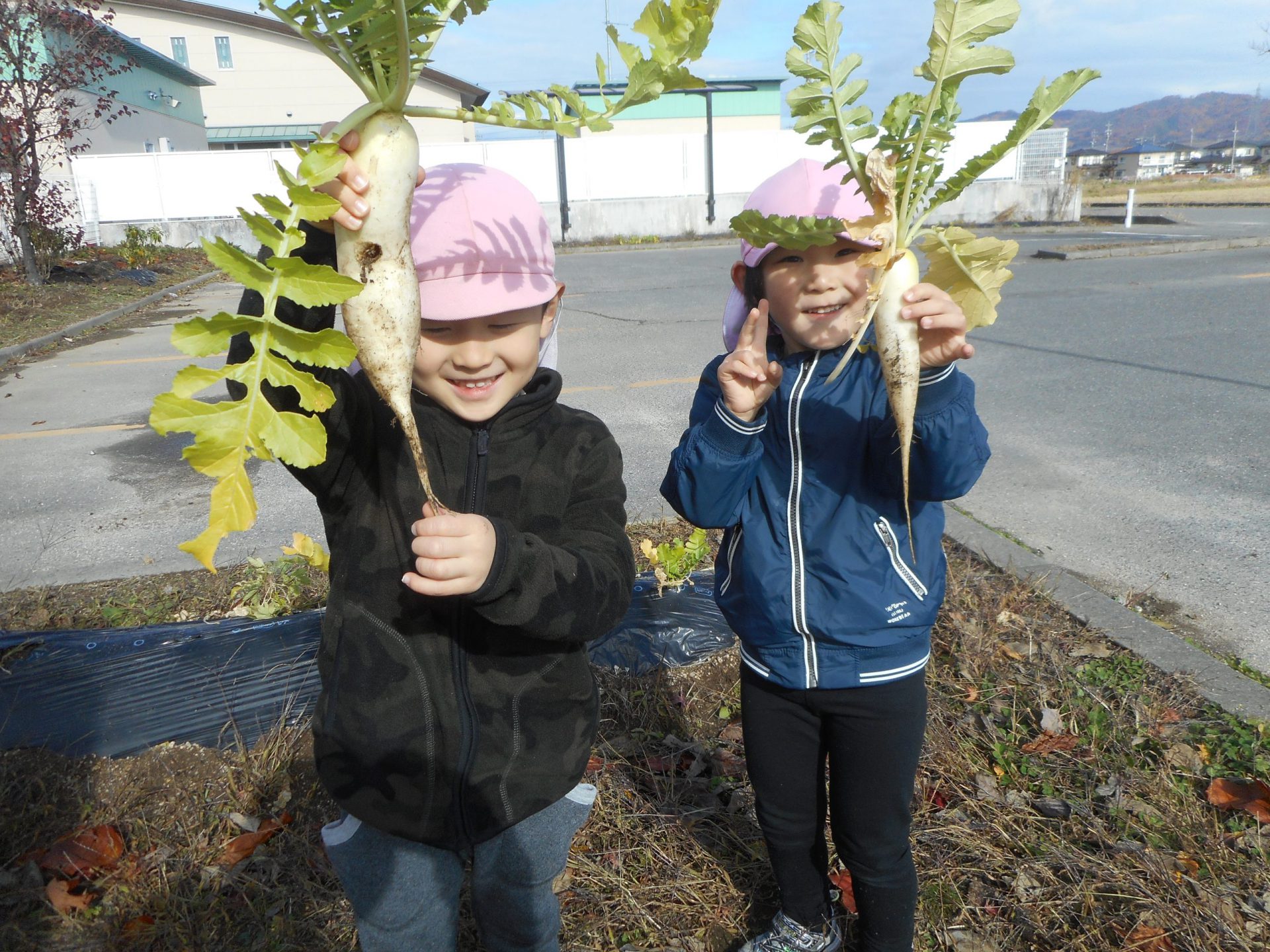 「かわいい大根ができたよ」 「たくさんとれたね」