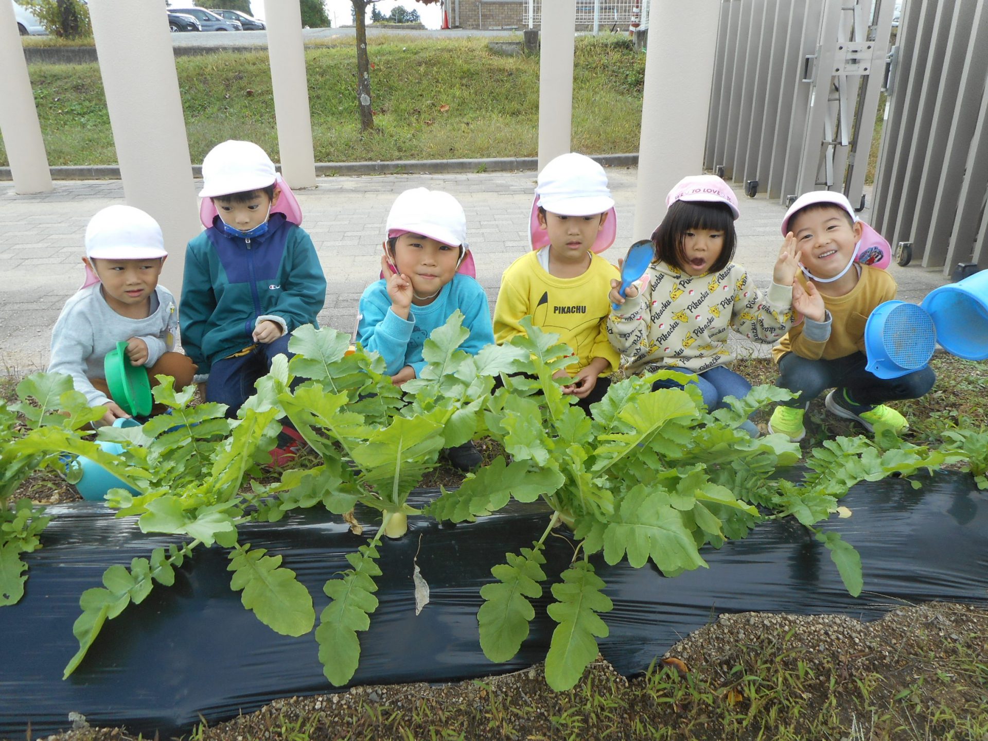 子どもたちも大きくなったら「お汁に入れて食べたい」「おでんにしてみたい」と楽しみな気持ちがあり、畑が登園時に目に入る場所だったので生長に気づいて教えてくれたり、日々大きくなることに目を向けて育てることができました。