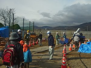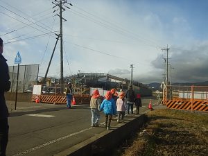 遠く国道の向こうに仮園舎(プレハブ)が見えました。