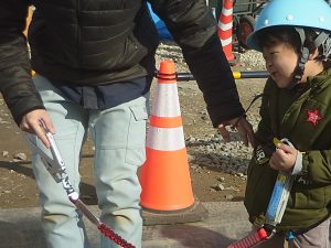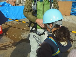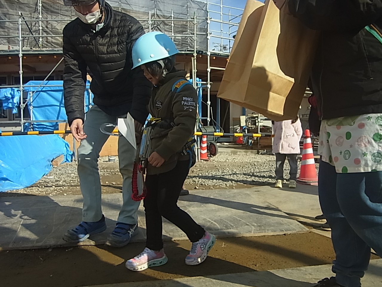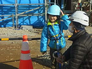 新園舎の屋根よりも高いところから紙飛行機を飛ばして、その飛行時間を計ってもらいました(飛行機が写っていなくてすみません・・・)
