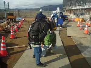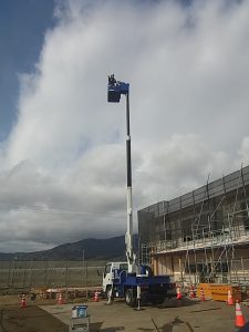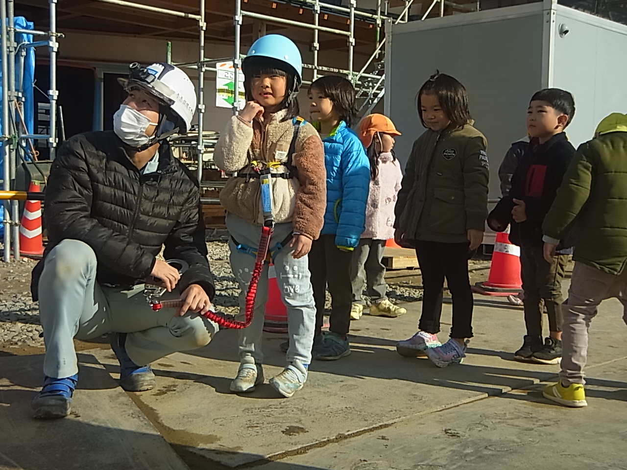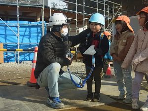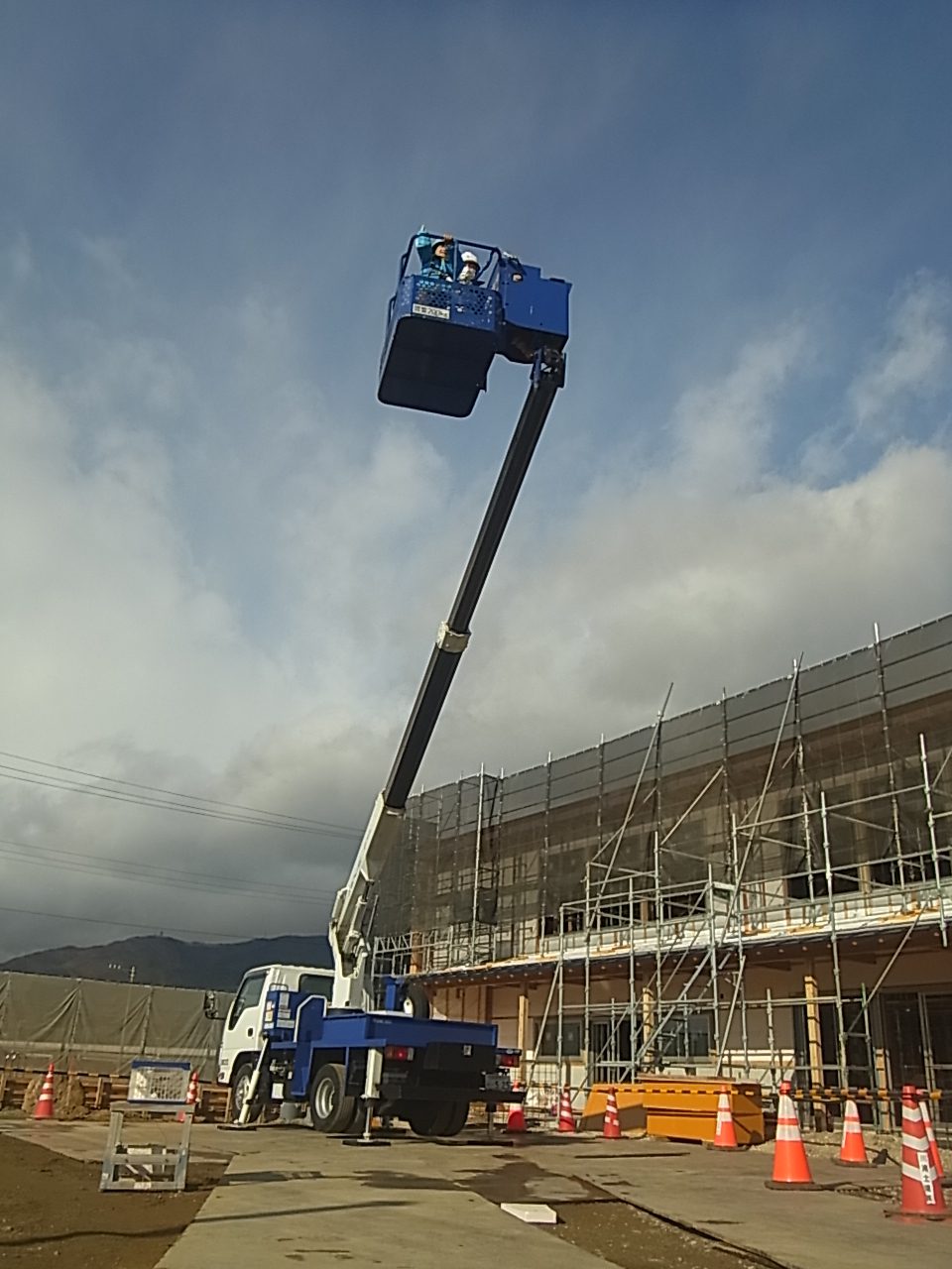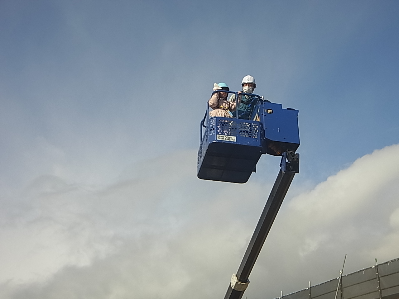 なんと、園庭予定地に停まっている高所作業車から「紙飛行機」を飛ばすのです!