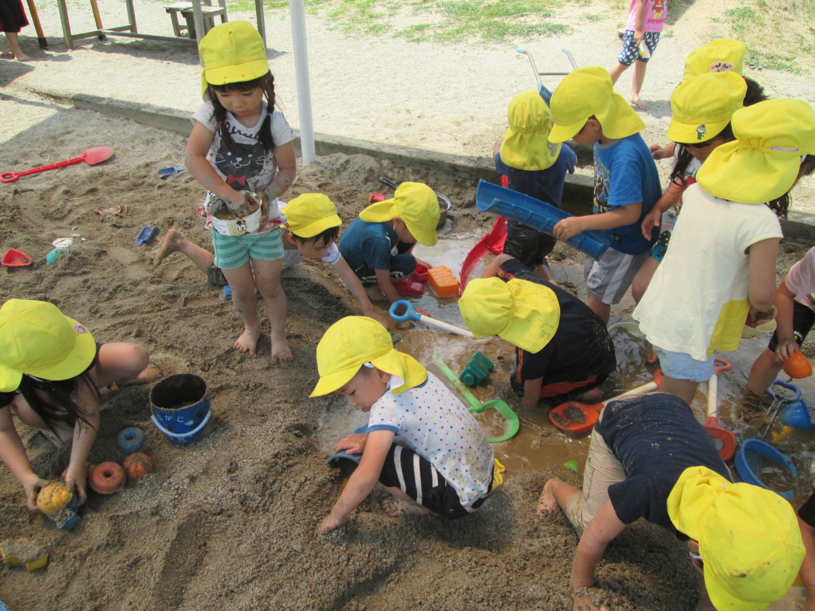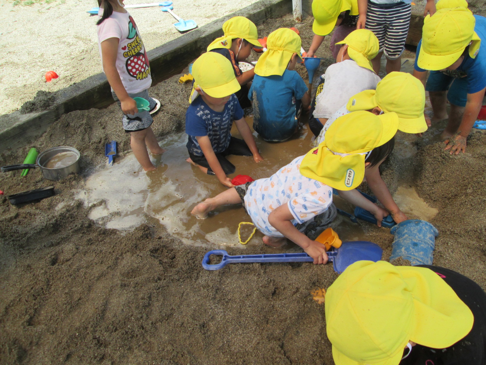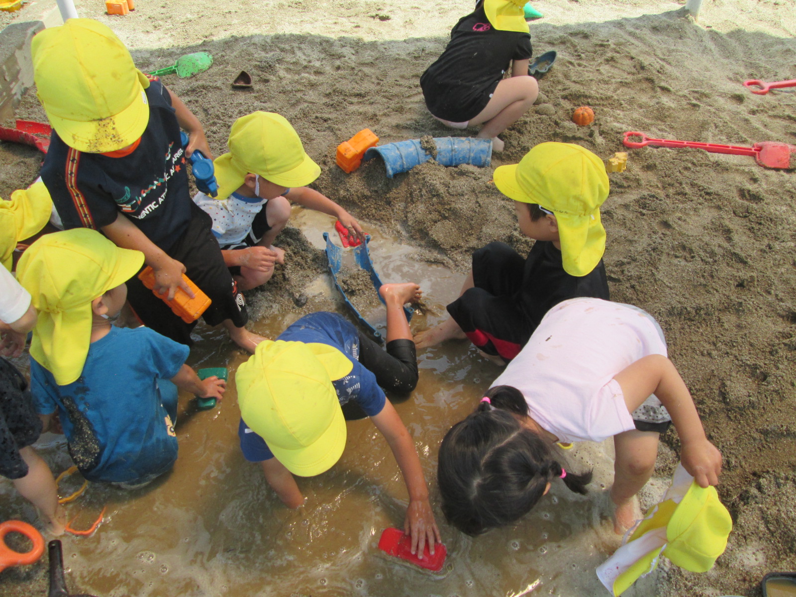 砂場に大きな水たまりをつくる子どもたち。