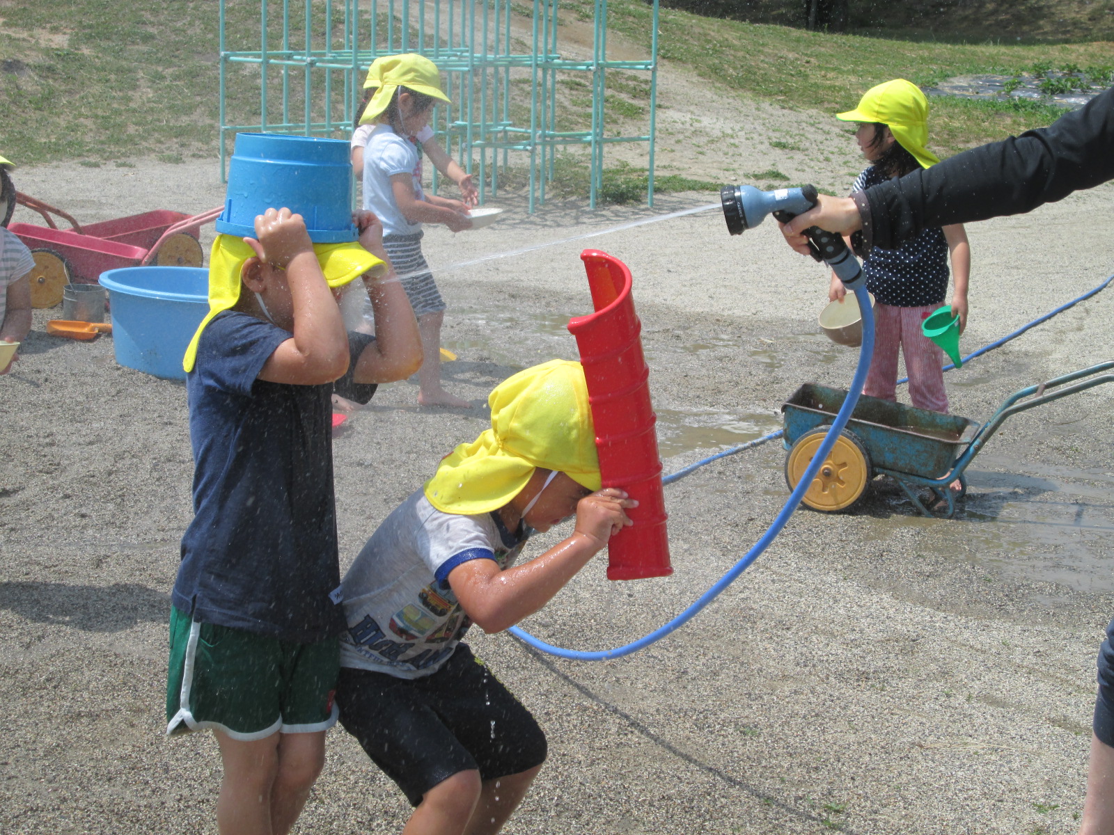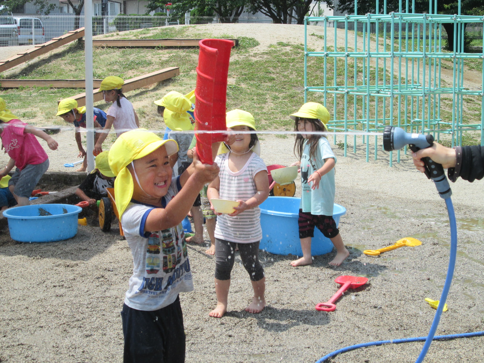 水遊びも回を重ねるごとにダイナミックになっていきます。砂場に大きな穴を掘り楽しむ子ども。保育者の放つホースの水に、スコップやバケツで身を守りながら果敢に向かってくる子ども。全身を使って遊んでいます。