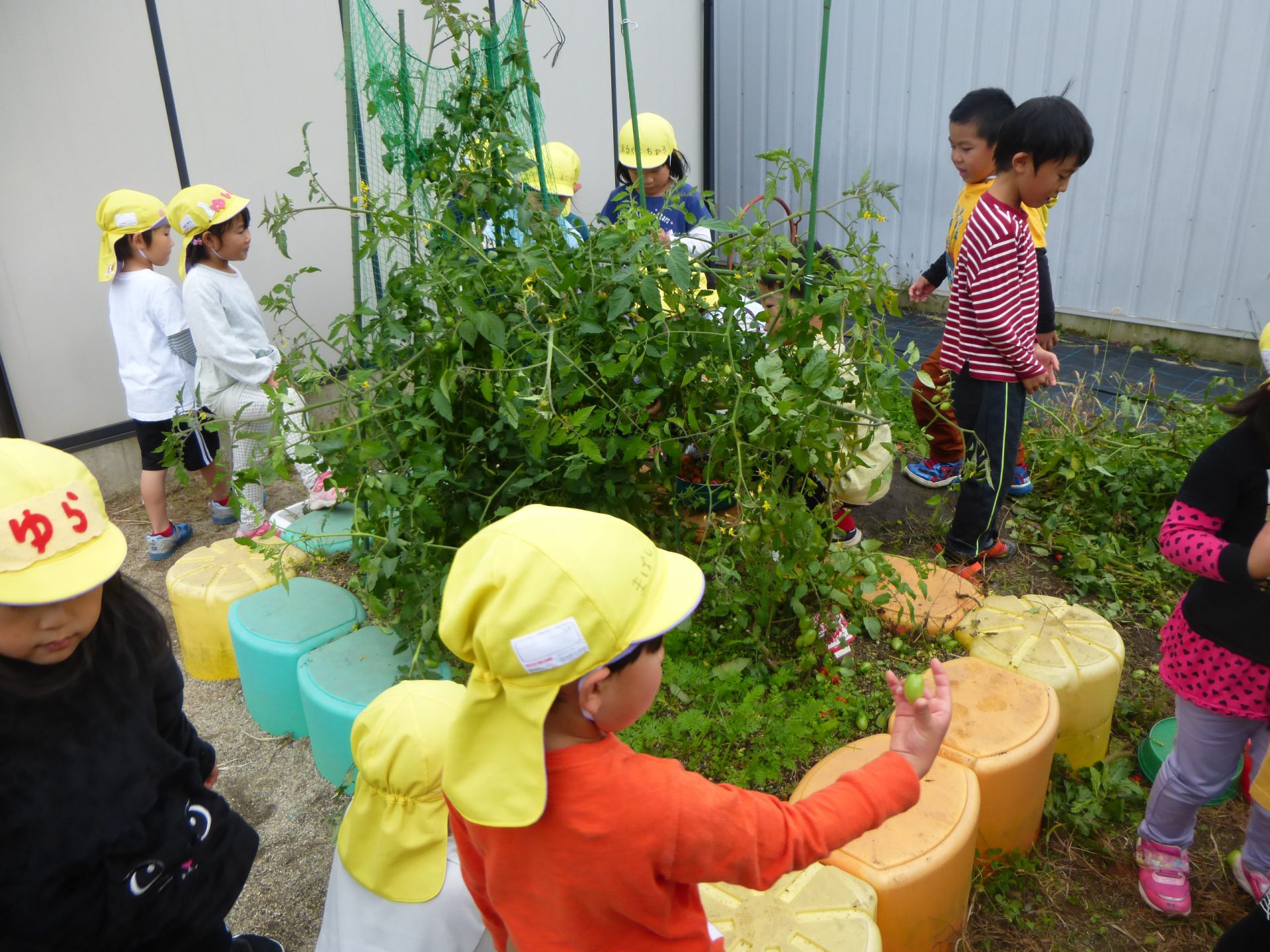トマトときゅうりを、夏のはじめに植え、成長する姿を楽しんでいた年長児たち。