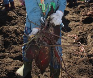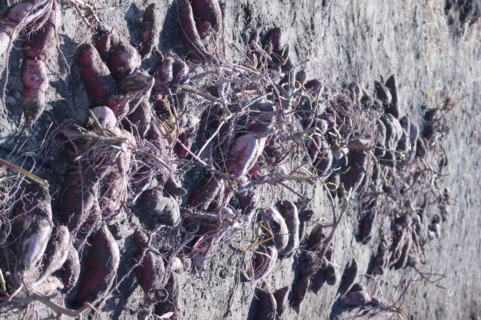 畑からツルが伸びている様子を見て、「この下に、サツマイモがあるの?」 「たくさんあるのかな?」 と楽しみにする様子。