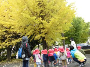 大きくてきれいなイチョウの木に釘付け子ども達。