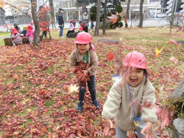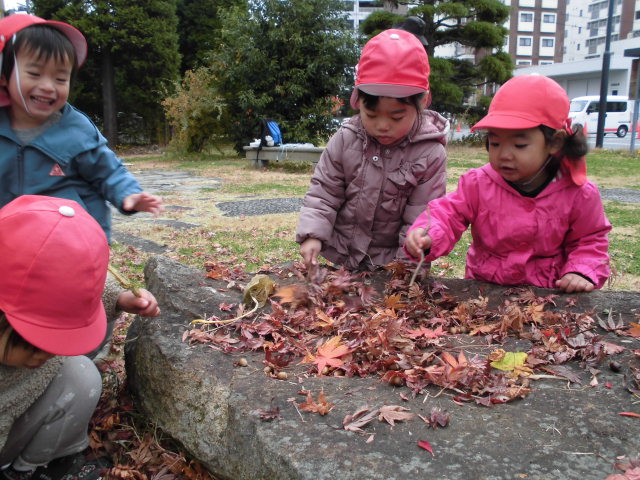 葉っぱを夢中で集めて散らしたり、イメージを膨らませて遊んだりと自然物からたくさんの遊びが生まれています。