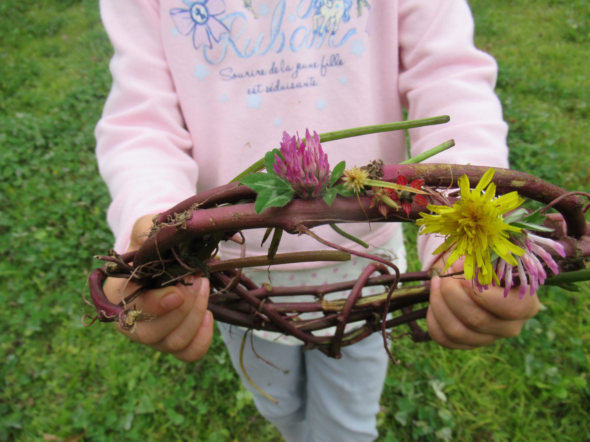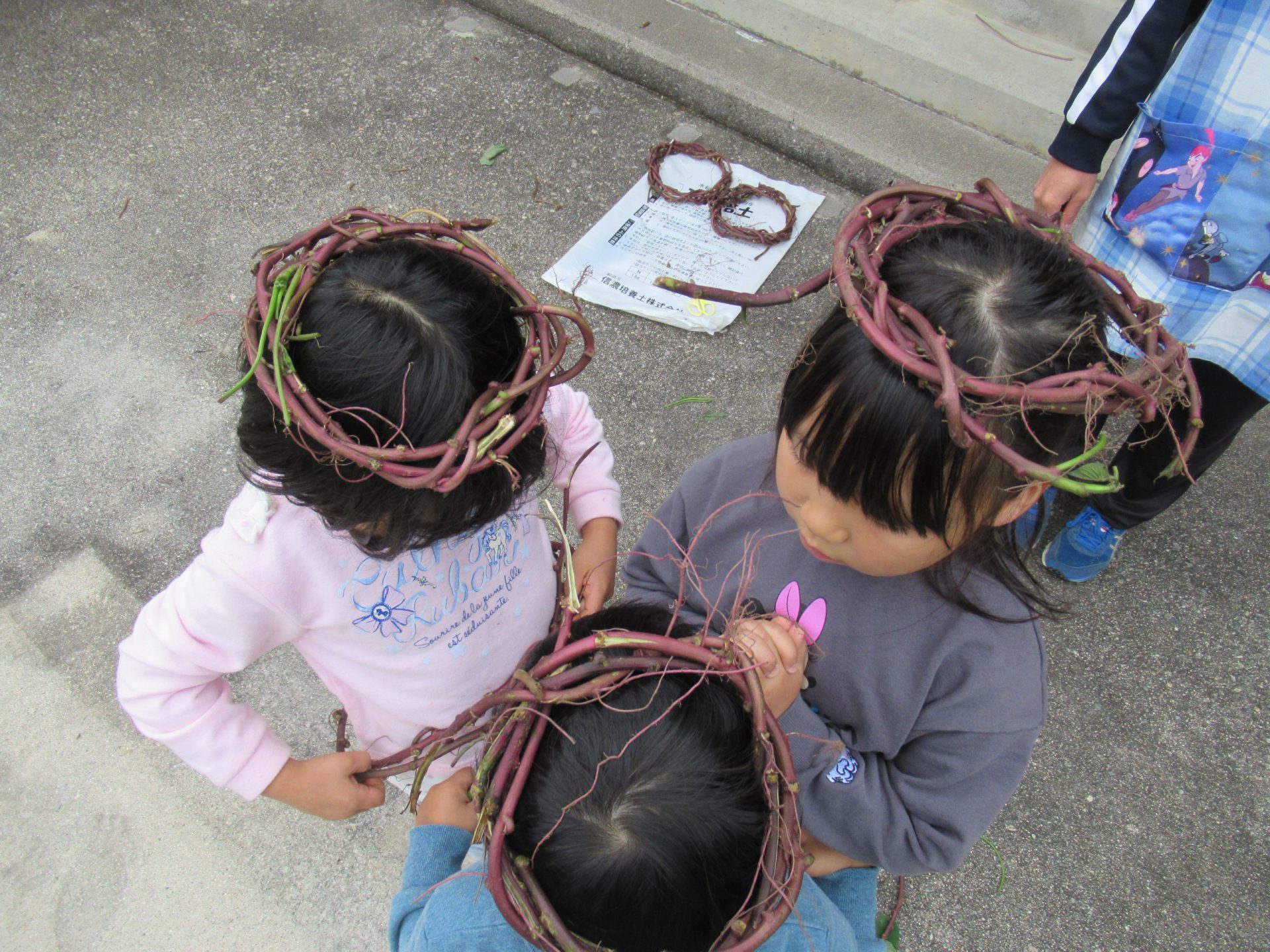 最後にクルクルと丸めて、リースの土台完成!さっそくお花を飾った子もいました。