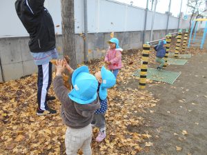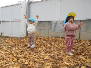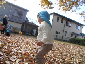 ・落ち葉に触れる中で、ちぎる・集める・投げる・踏むなど色々なことを試している姿がみられました。これからも身近な自然に思い思いに触れていってほしいと思います。