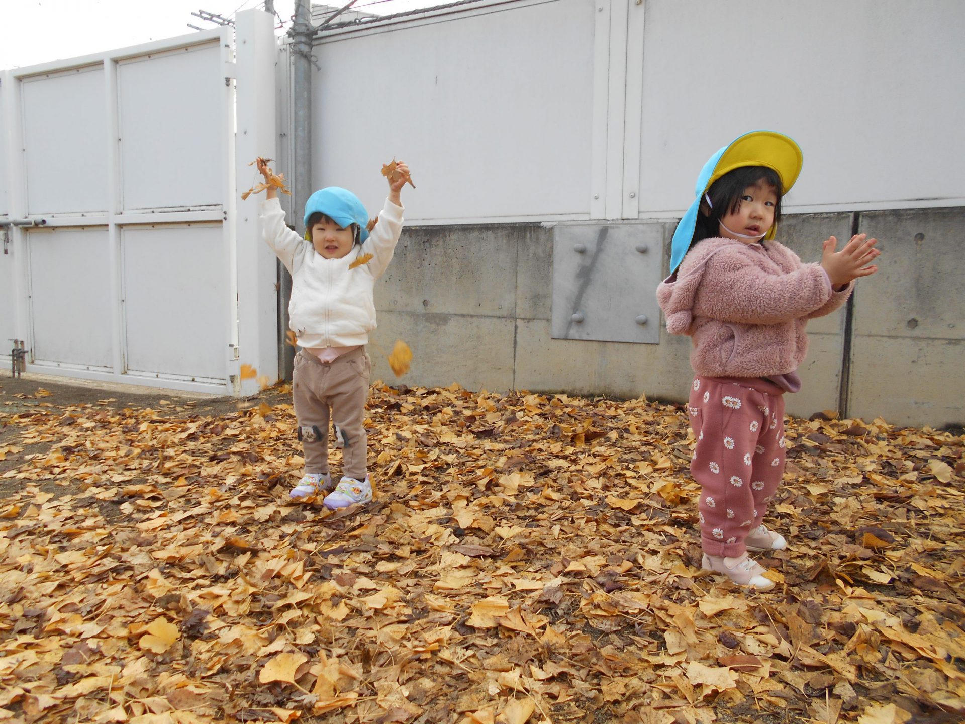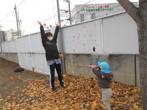 保育士が落ち葉を集めてふわっと投げて落ち葉シャワーにすると