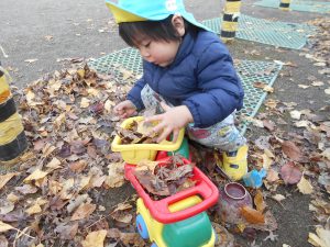 落ち葉をお気に入りのおもちゃに山盛り入れている子もいました。