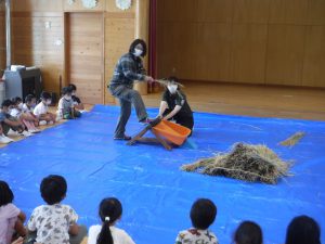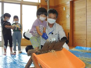 更に、「千歯こき」という昔ながらの脱穀機を地域の方に使わせていただきました。