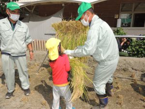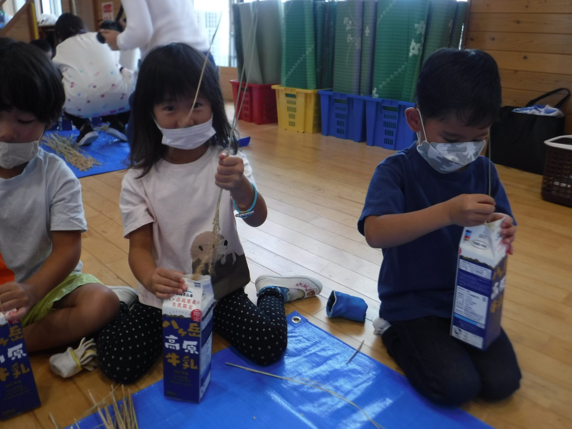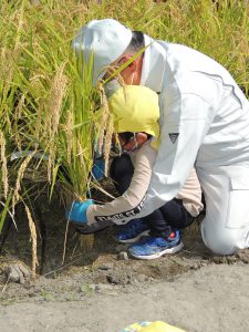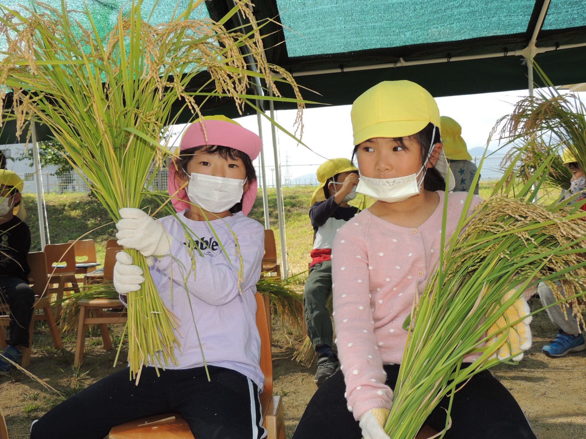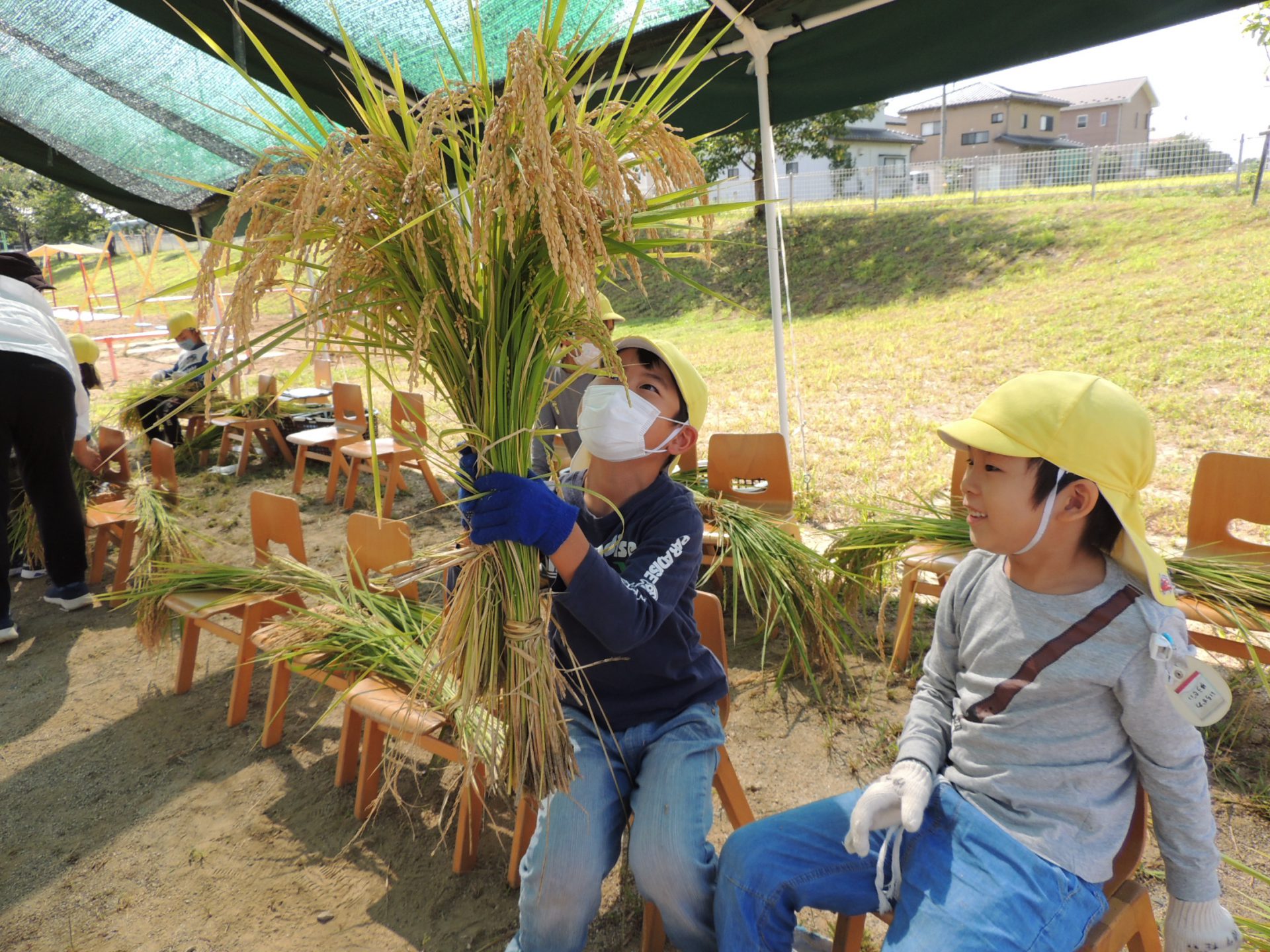 園庭の田んぼに田植えをしてから、田んぼで虫探しをしたり、かかしを作ったりしながら、稲の生長を見守ってきた子ども達。
