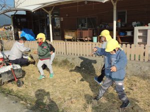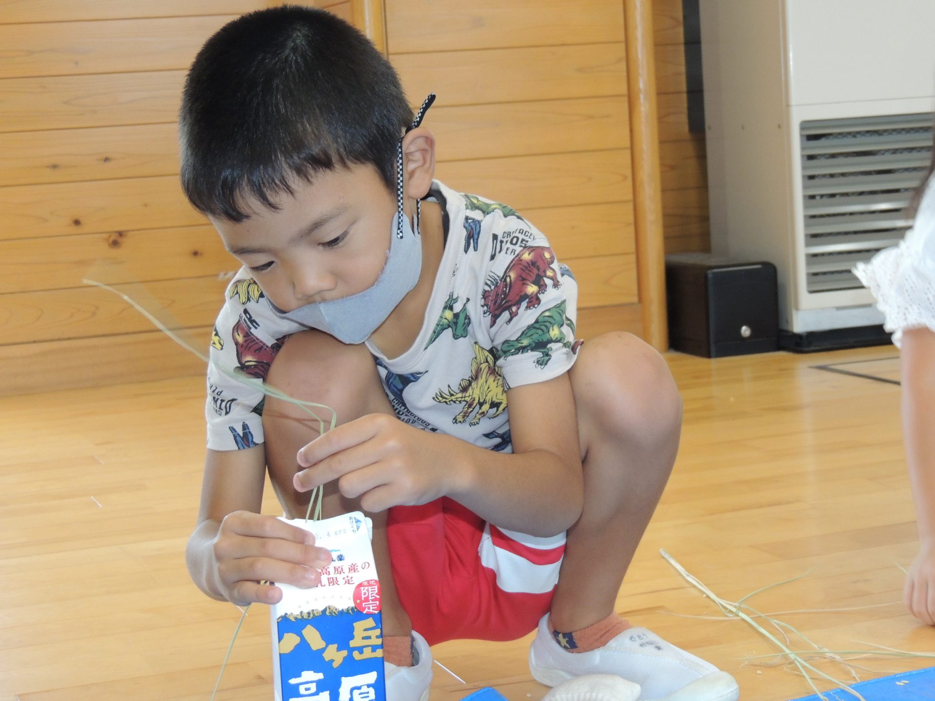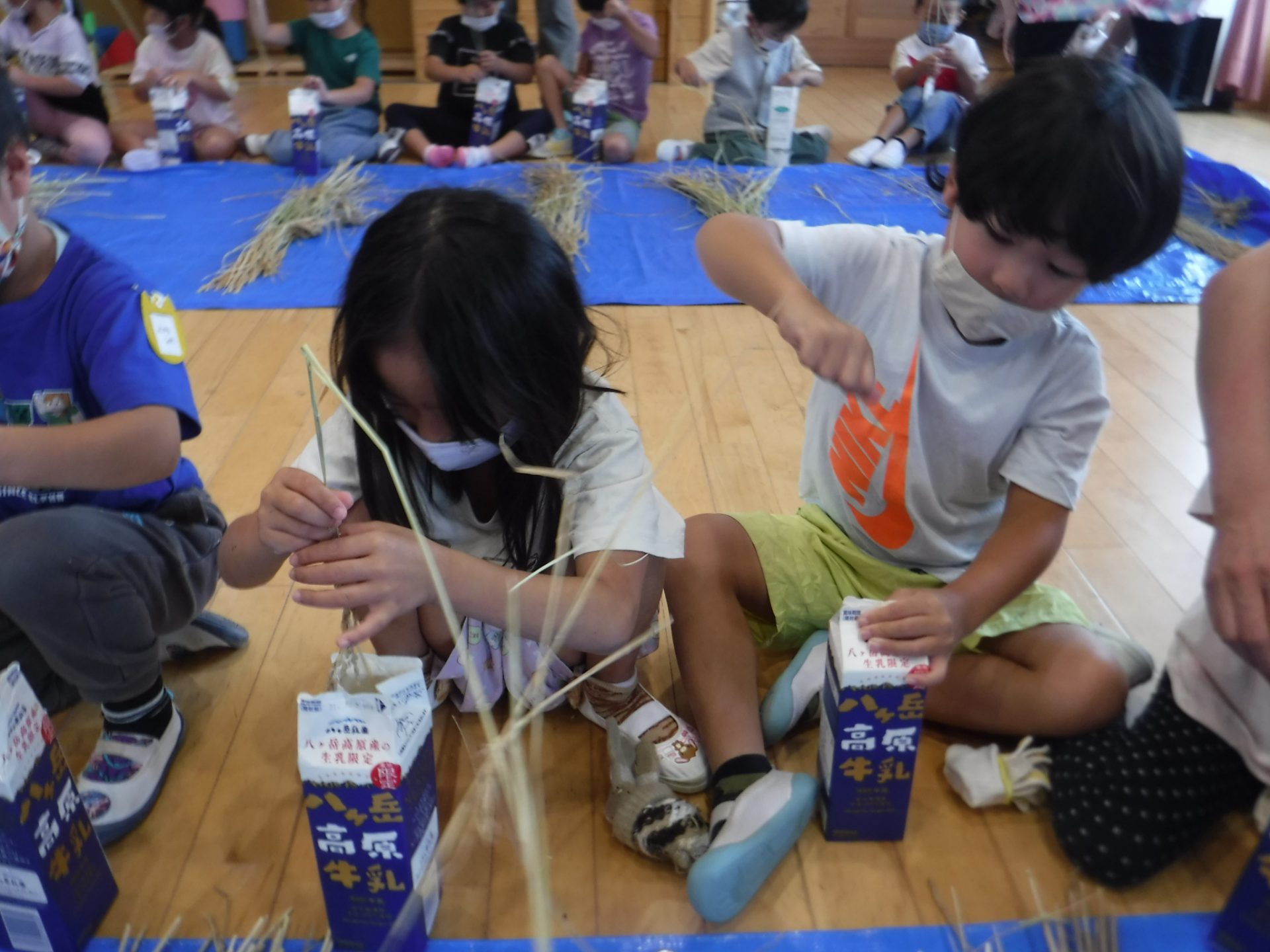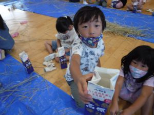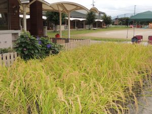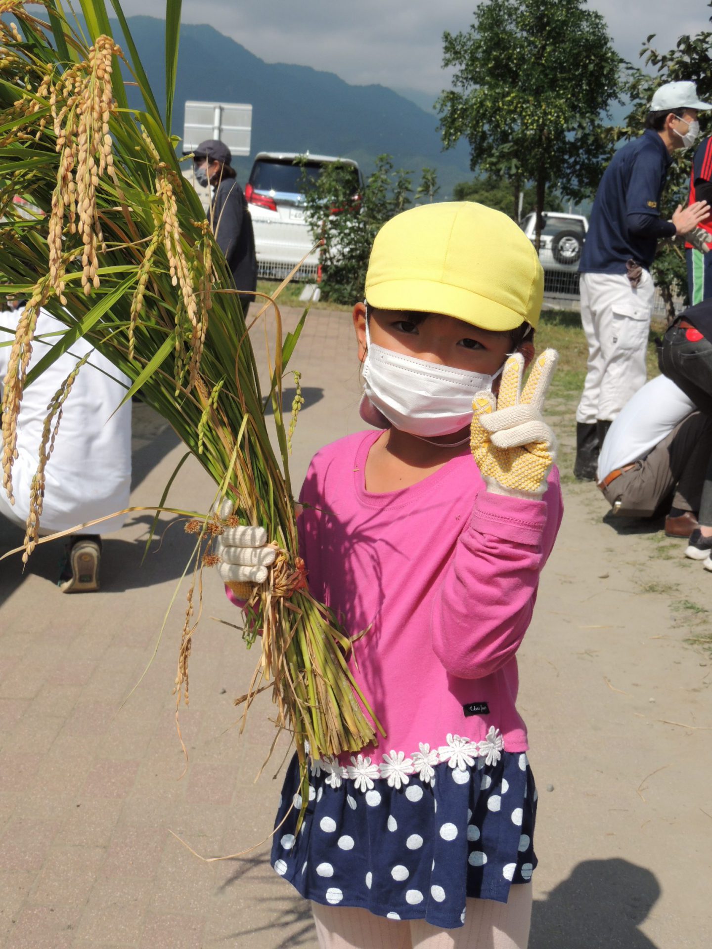園庭の田んぼに田植えをしてから、田んぼで虫探しをしたり、かかしを作ったりしながら、稲の生長を見守ってきた子ども達。