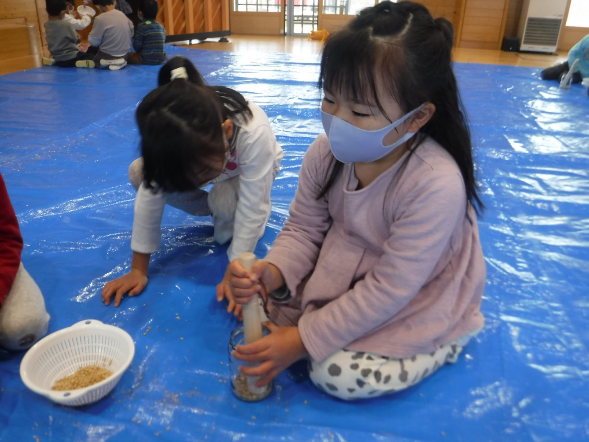 「硬い!」「うまくいかないな」と言いながらも、頑張って脱穀していきます。