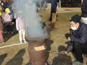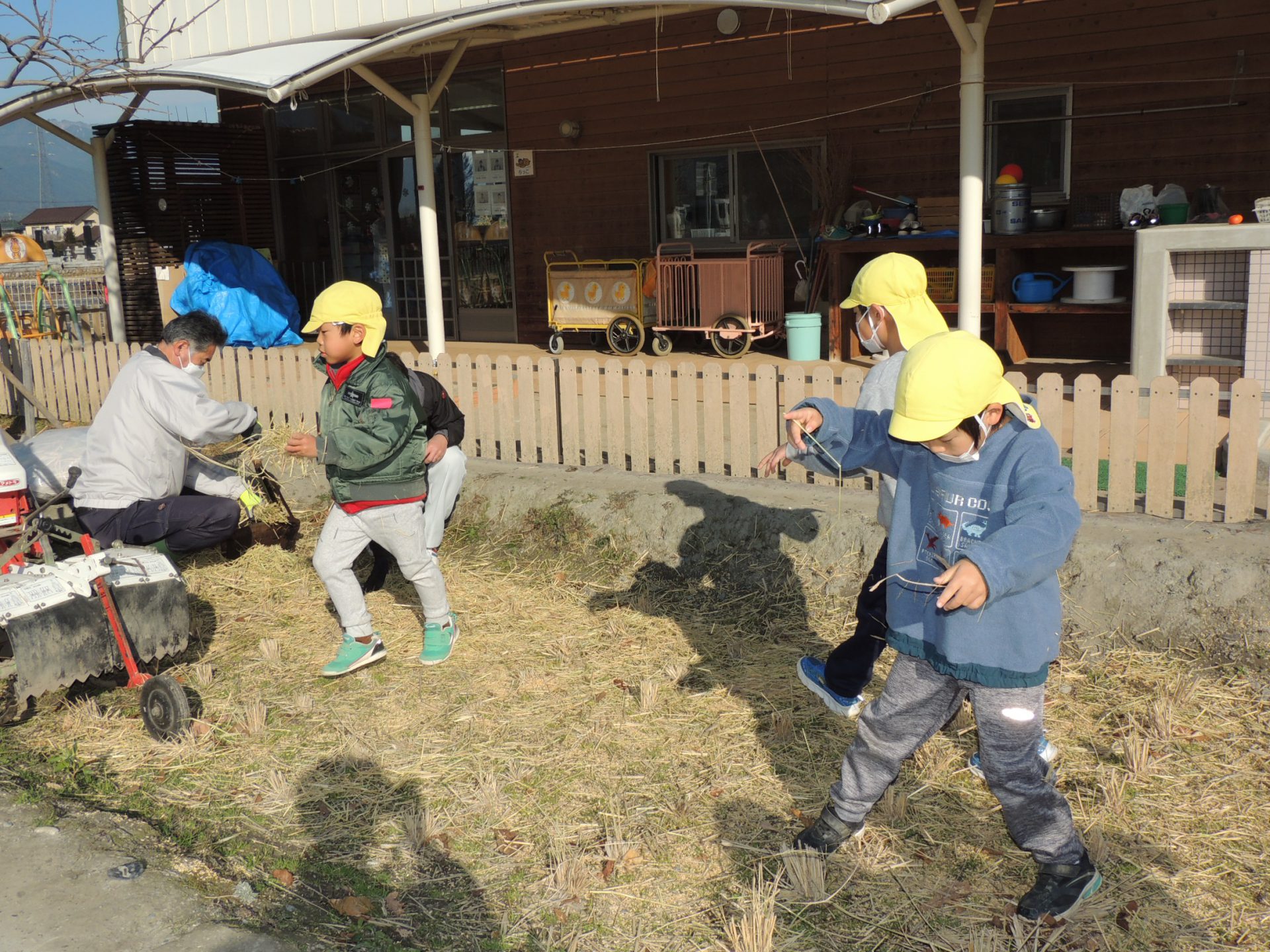 ご飯が炊けるまでの間に、残った籾殻や稲わらを田んぼに返しました。
