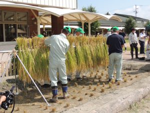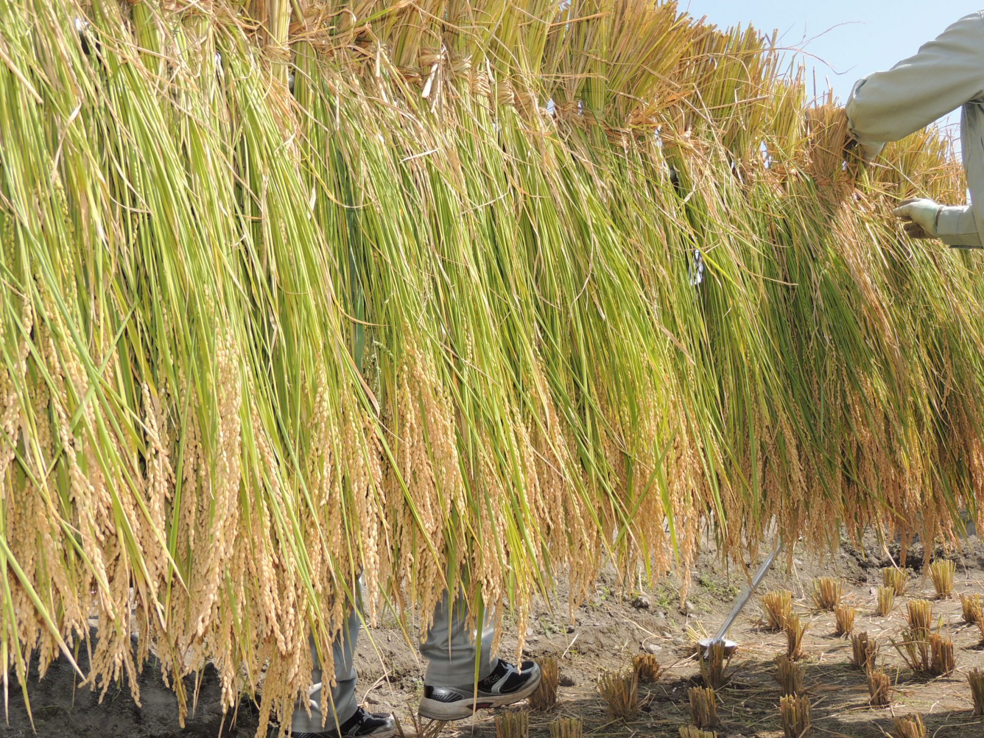 ハゼ掛けをした稲が乾きました。次は脱穀を行います。