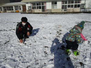 5歳児の友達を見て、2歳児のkくんも見様見真似の雪だるま作り!