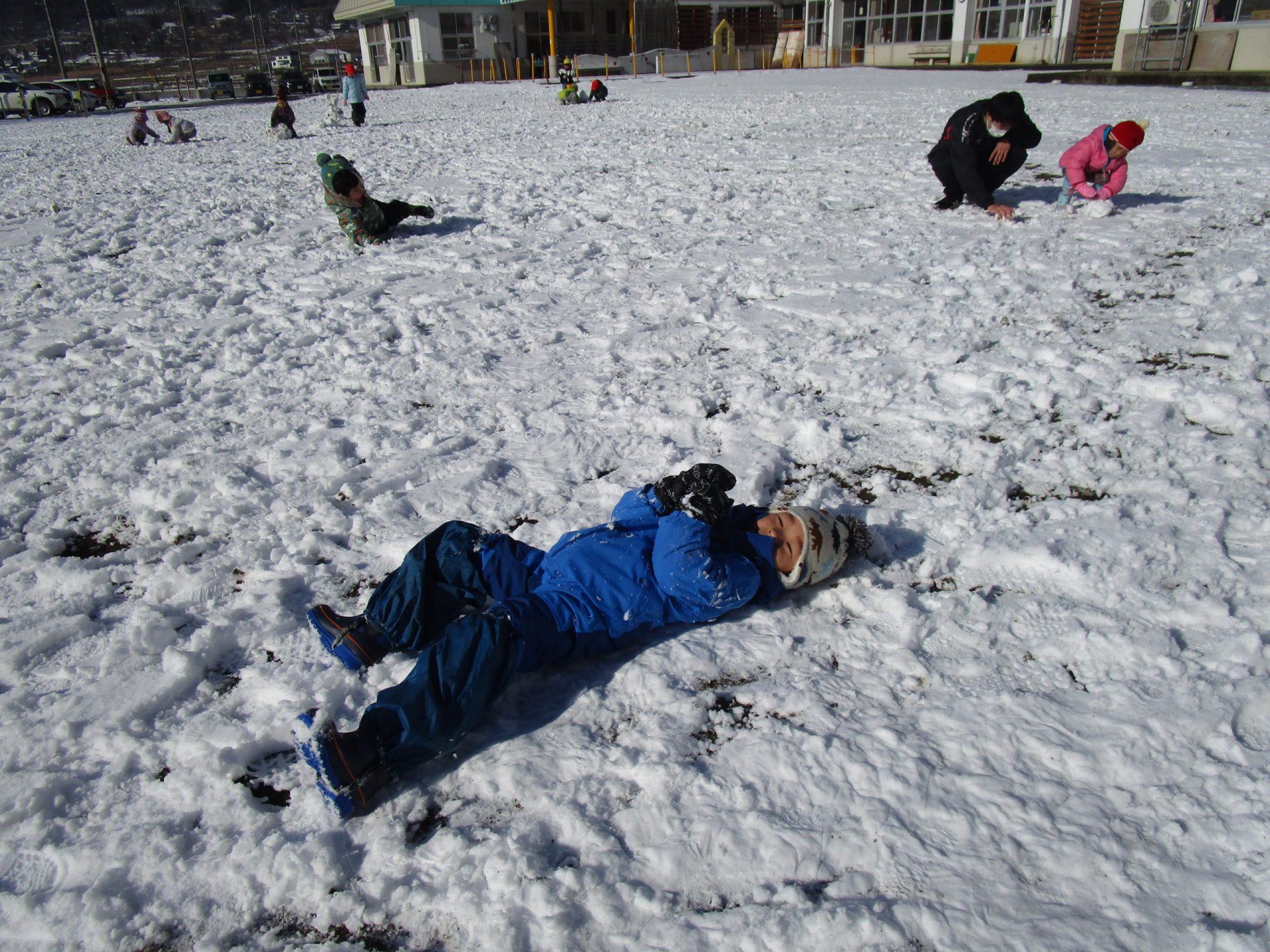 「先生ぇ〜大きい雪玉一緒に作ってよ〜」の子どもに頼まれたり