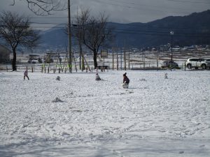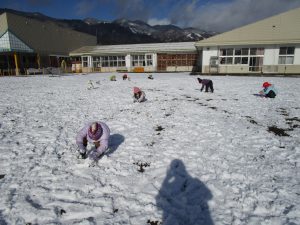 今日は、雪の量が少なく、全園児が出ればきれいな雪争奪戦!