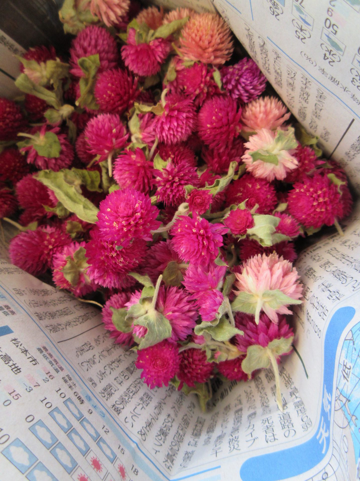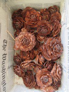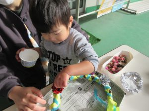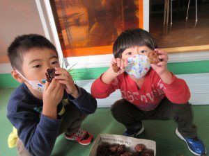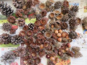 「どれにしようかな、これもあれもいいなー」「僕が拾ったどんぐり、いろいろな種類のどんぐりあるんだね」「金やシルバー色がついてきれい」「山で拾った木の実だね」「バラみたいな松ぼっくりあるんだ」「みんなで摘んだお花、素敵」蔓もお散歩で見つけてきました。すがかわは素敵な素材の宝庫です。
