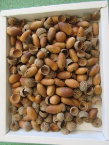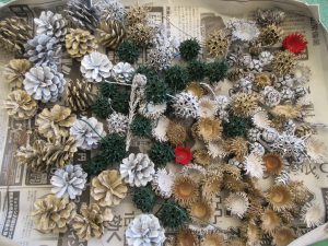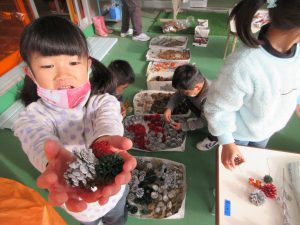 保育園近くの小さな山の中で拾ったどんぐり、木の実(まつぼっくり、くぬぎ、杉のみ、)近所の方から頂いた、シダーローズ、モミジバフウ、ツガの実、草花(月見草の枝、千日紅(保育園で花壇に咲いていたもの、))など、身近にあるものを、保育士が色付けしました。子供たちは楽しそうに木の実を飾っていました。
