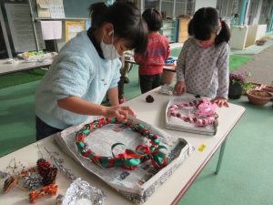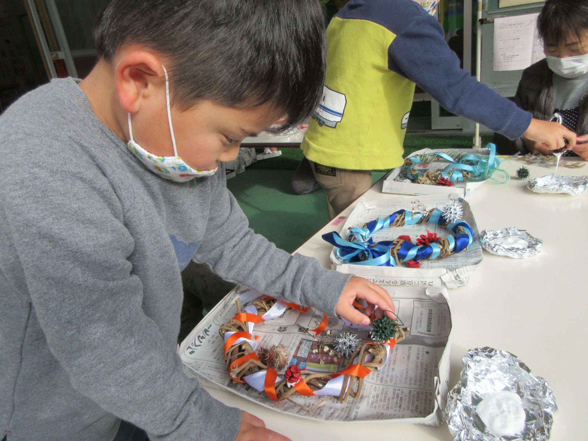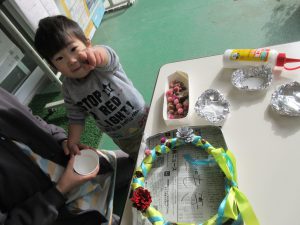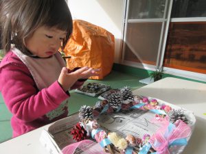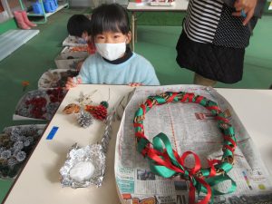 クリスマス発表会に飾っておうちの方に見て頂きます。子供たちの楽しそうな笑顔、つぶやき、友達と一緒に工夫しながら飾り付けたり、未満さんも保育士と一緒に飾り付けていました。須賀川で生まれ育ち、自然に恵まれていることに感謝したいと思います。リースづくり楽しかったね。