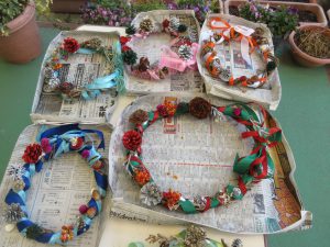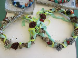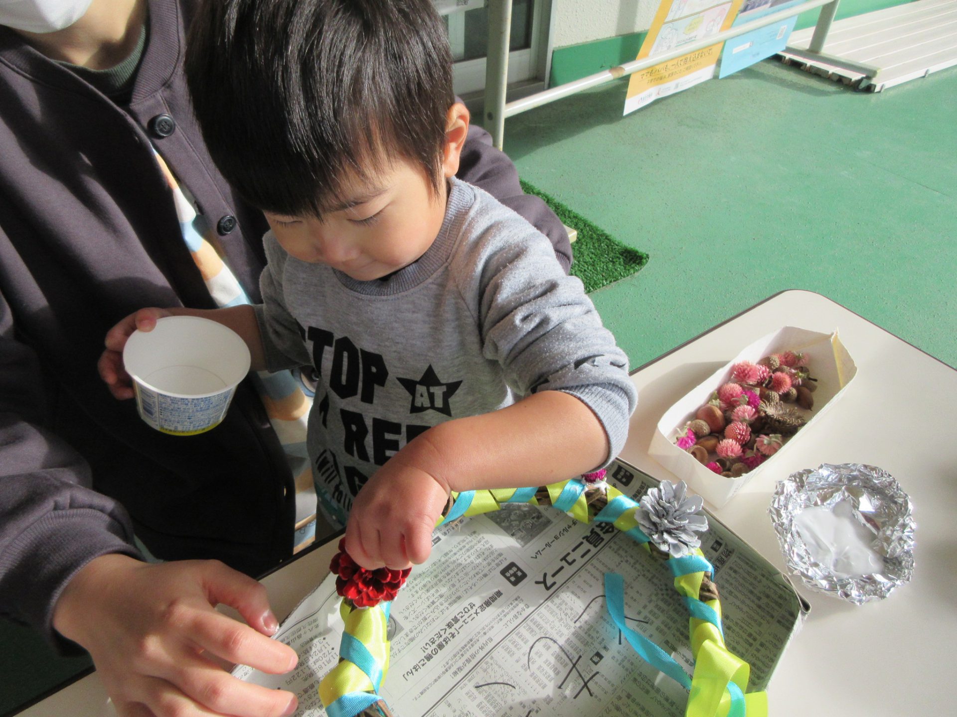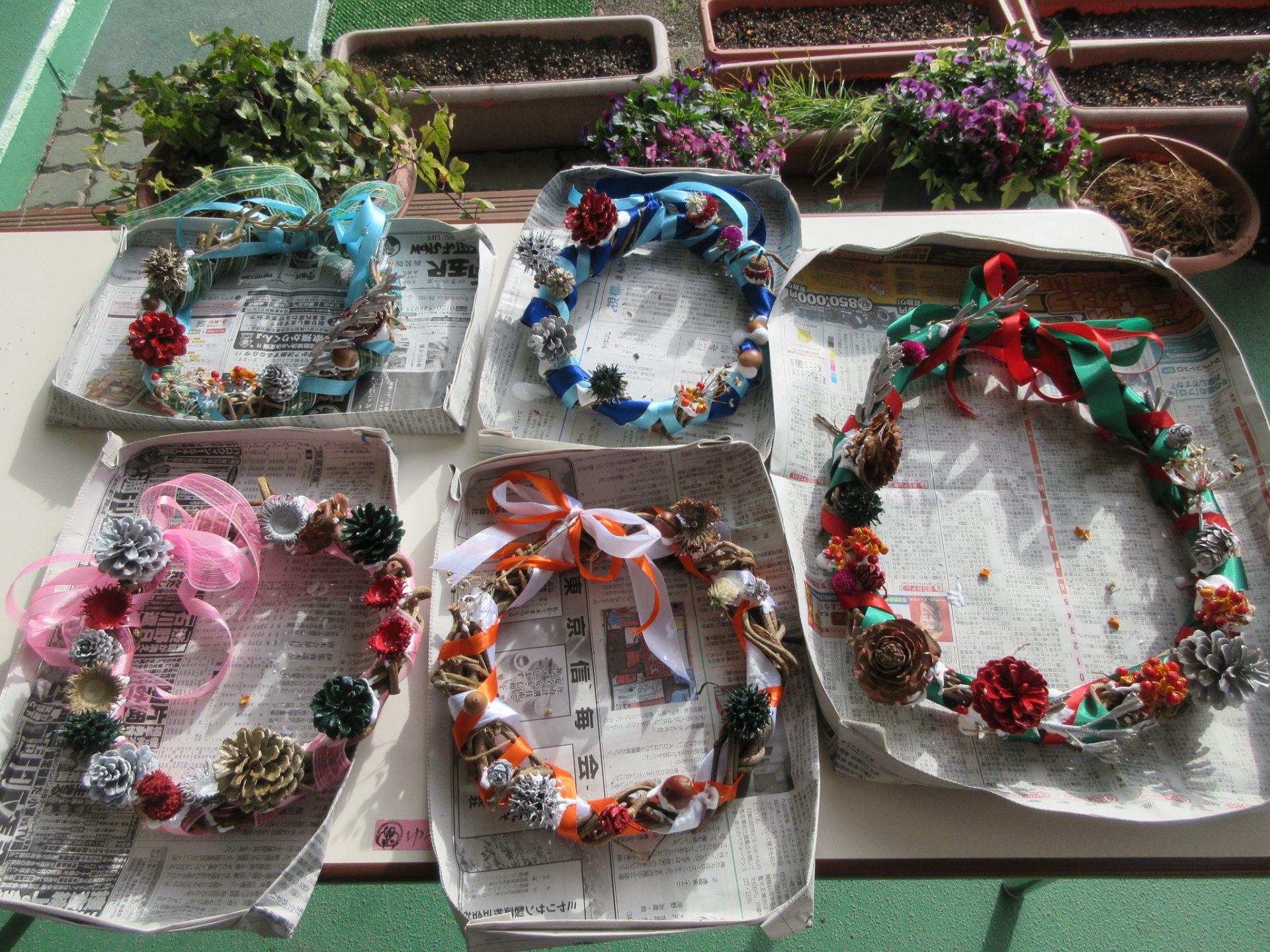 毎年、子供たちと園外保育に行き木の実や草花を拾い、秋の終わりごろにリースづくりをしています。