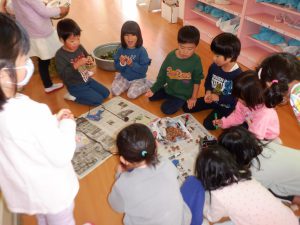・最初にウサギの人形を作った子から、ほとんどの子が真似をしてたくさんのウサギを作って楽しんでいた。繰り返し作って遊ぶことで、そこに子どもたちそれぞれの工夫やアイディアがどんどんプラスされていき、更にその作品を見た友だちがまた真似しながらも工夫が加わっていく様子が多く見られた。作品は個人であるが、子どもたちは友だちと深く関わり、互いの刺激を受けながら一人ひとりの学びや発見に繋がっている事を感じた。