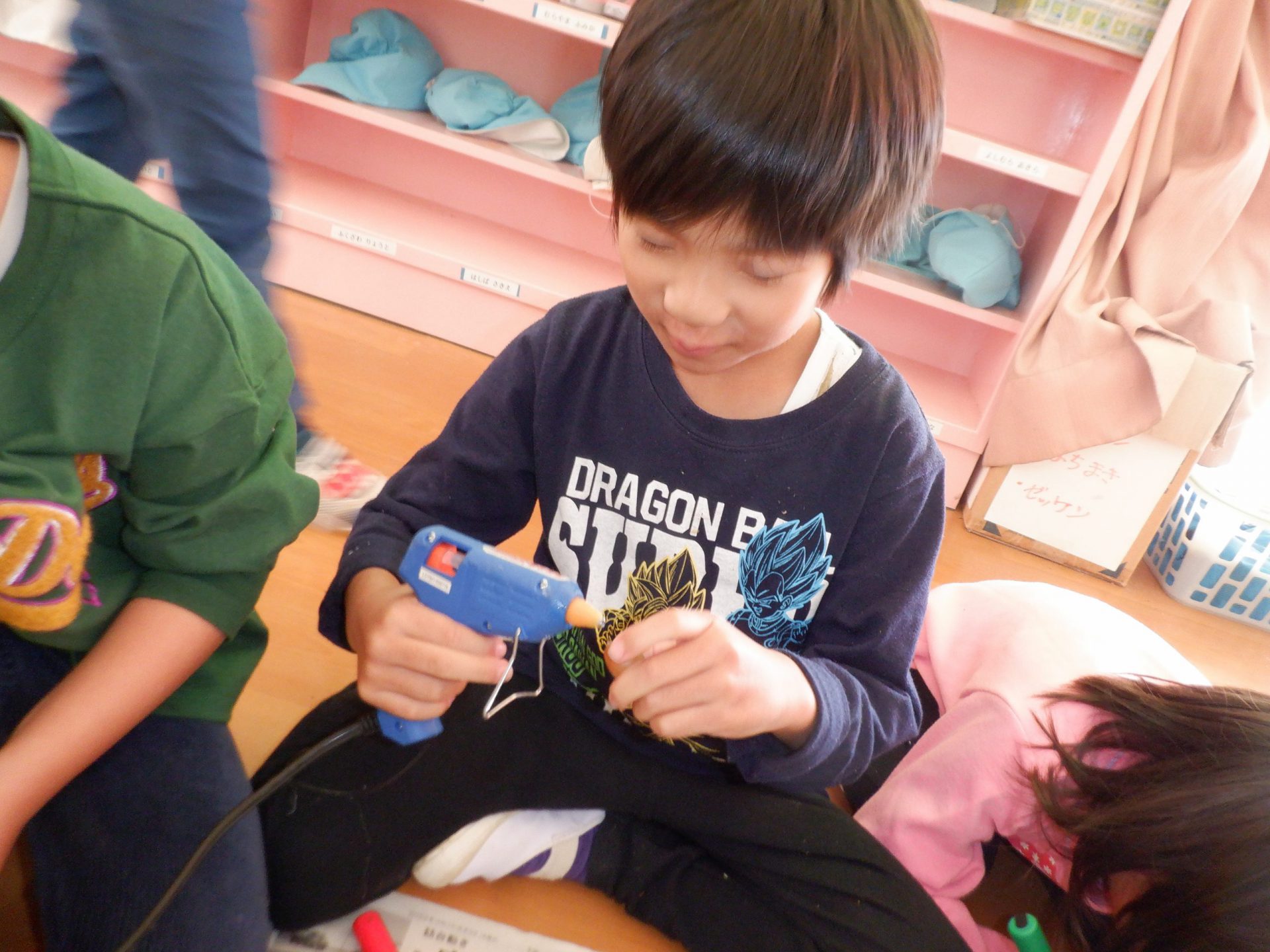 友だちの楽しそうな姿を見て、最初は「グルーガンはこわいよお~熱いから~」と言っていた子どもたちも周りに集まってきて見ていました。
