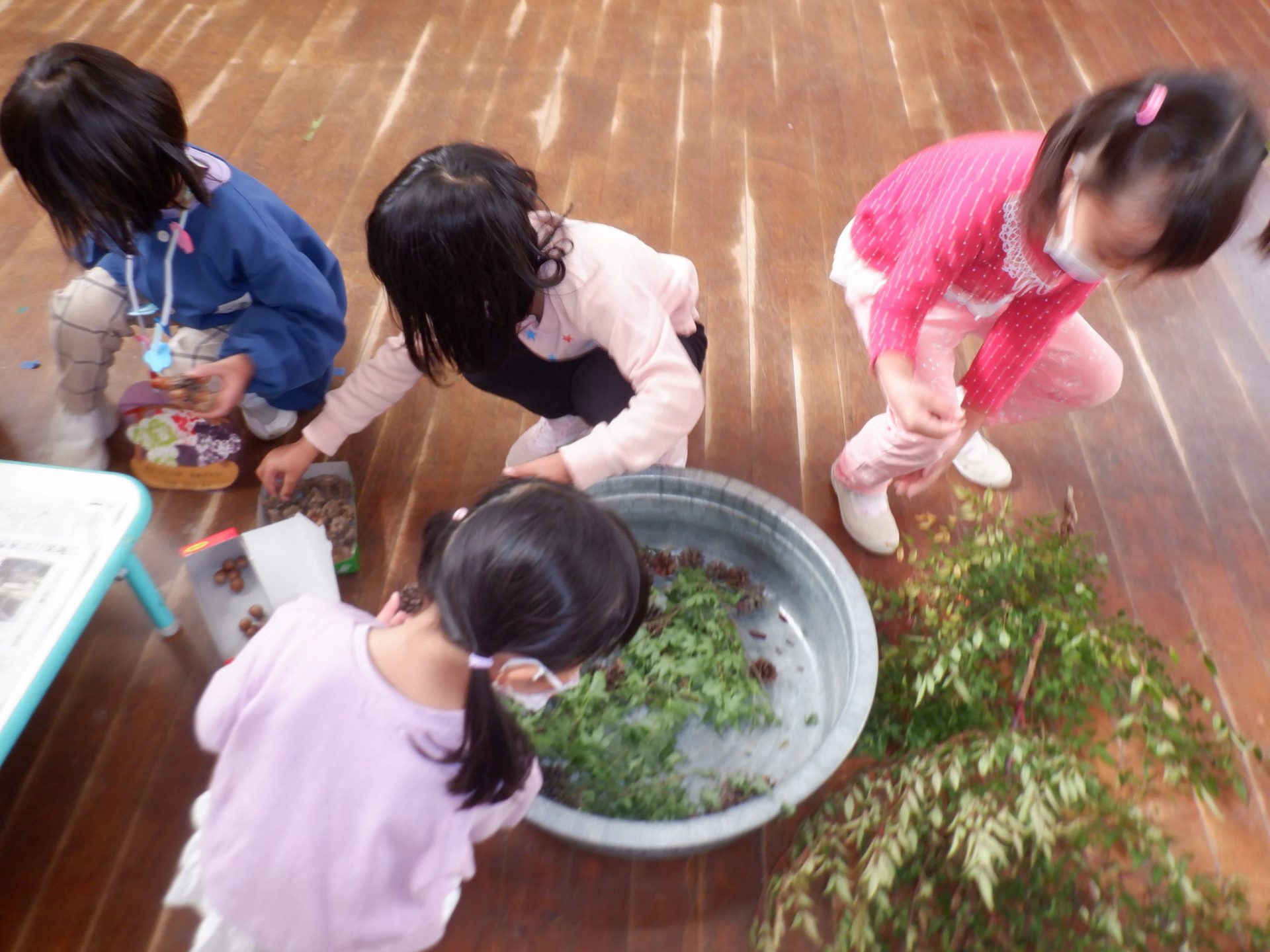 ・同じ種類のドングリや実などの自然物でも、形や色、大きさが様々であり、その中から自分のイメージに合った物を選ぶ姿があった。一つひとつが異なるからこそ、子どもたちはその自然物を手に取って見たり比べたり、感じたりする経験を自然にしている。拾ってきた自然物に制作を通して触れることで、戸外でなくても五感を使って感じたり学んだりする経験をしているように思う。