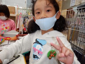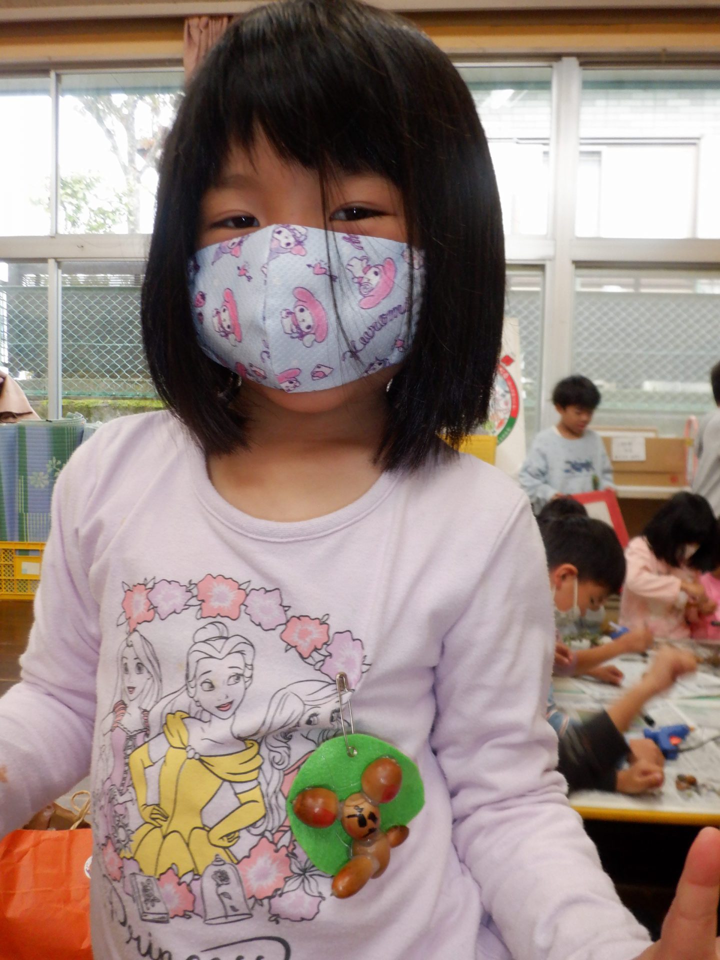 かわいいバッジになったので、「小さい人のプレゼントにしよう!」「喜んでくれるよ!」と、みんなで全園児分の人形を作り、バッジにして、年長児お楽しみ企画の時のお土産として小さい友だちにプレゼントしました。